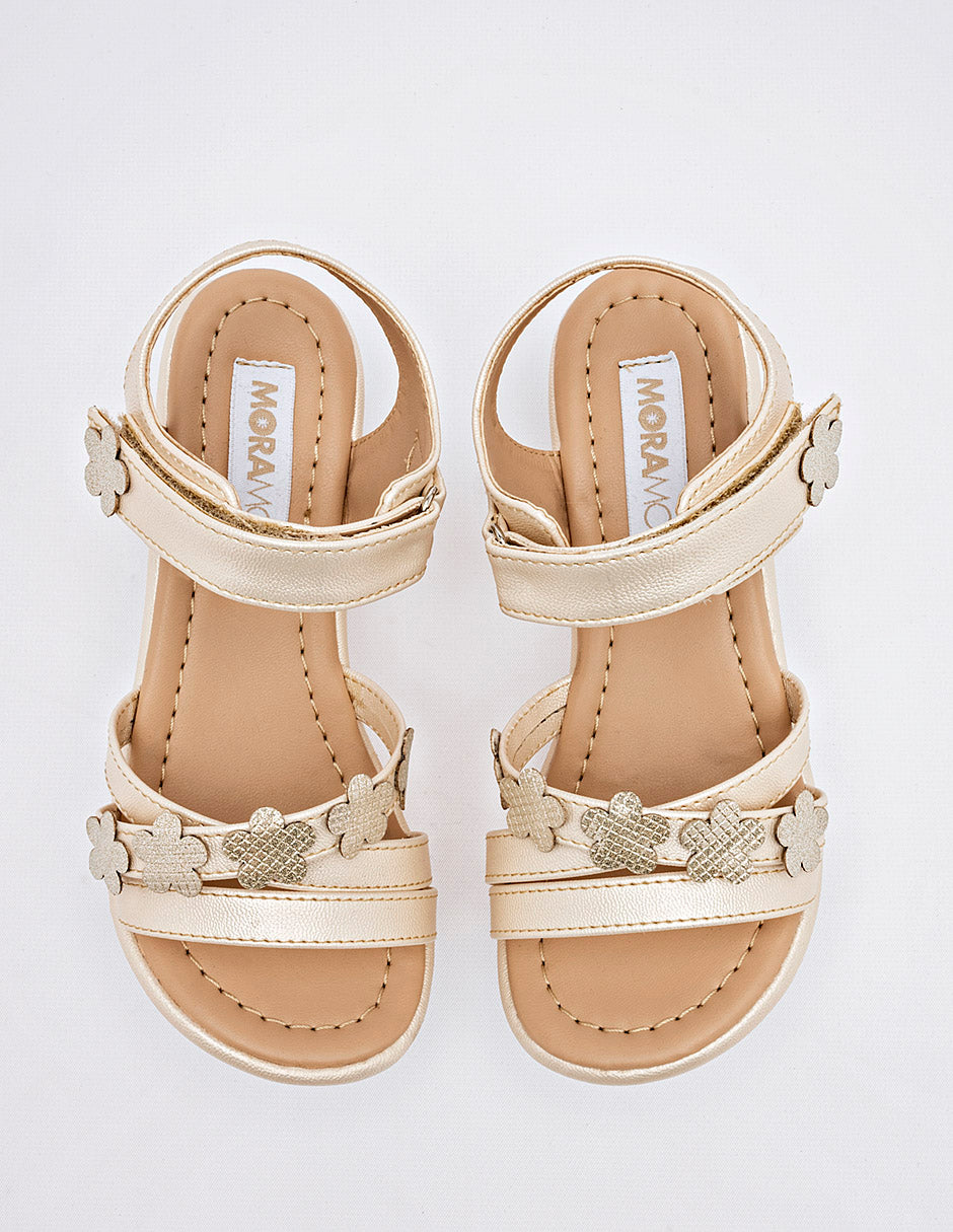 Una sandalia encantadora y moderna que combina estilo y comodidad para las más pequeñas. Confeccionada en un material sintético de acabado metálico en un elegante color champaña estas sandalias son perfectas para cualquier ocasión. El diseño presenta dos tiras frontales adornadas con delicadas flores troqueladas y con glitter, que añaden un toque de fantasía y glamour. La tira superior tiene un práctico y seguro cierre de velcro, lo que facilita que las niñas puedan calzarse y descalzarse por sí mismas. Ideal para paseos, fiestas o eventos especiales. Horma normal . "Donde la moda se encuentra con la fantasía. ¡El brillo de sus sueños en cada paso!" Corte Sintético, Forro Sintético, Suela Sintética