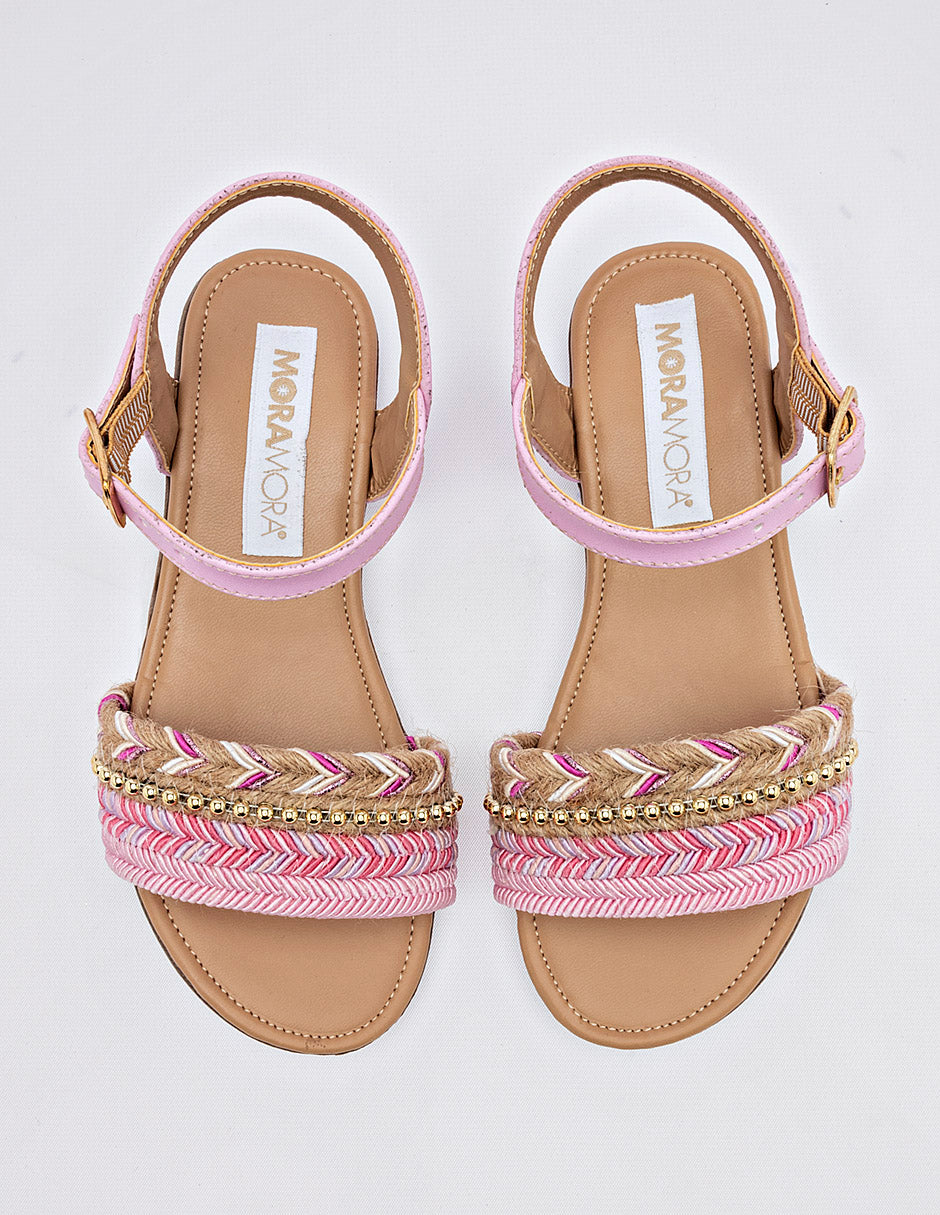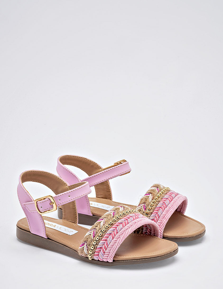 Confeccionada con una suave tira de tobillo en color lila y un práctico cierre de hebilla metálica dorada que asegura un ajuste cómodo y seguro. El diseño frontal es el protagonista, con una tira ancha adornada con un vibrante trenzado multicolor que combina tonos rosados, blanco y un hilo tipo yute, creando un atractivo efecto bohemio y artesanal. Esta tira se complementa con delicadas aplicaciones de pequeñas cuentas doradas, añadiendo un toque de brillo y sofisticación. Ideales para el día a día, paseos, vacaciones o para complementar looks de verano con un toque dulce y étnico. Horma normal . "Donde la comodidad se encuentra con la magia del verano. ¡Sus sandalias favoritas!" Corte Sintético, Forro Sintético, Suela Sintética