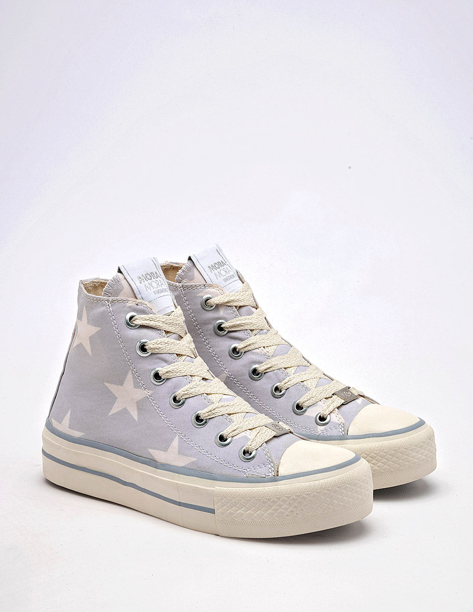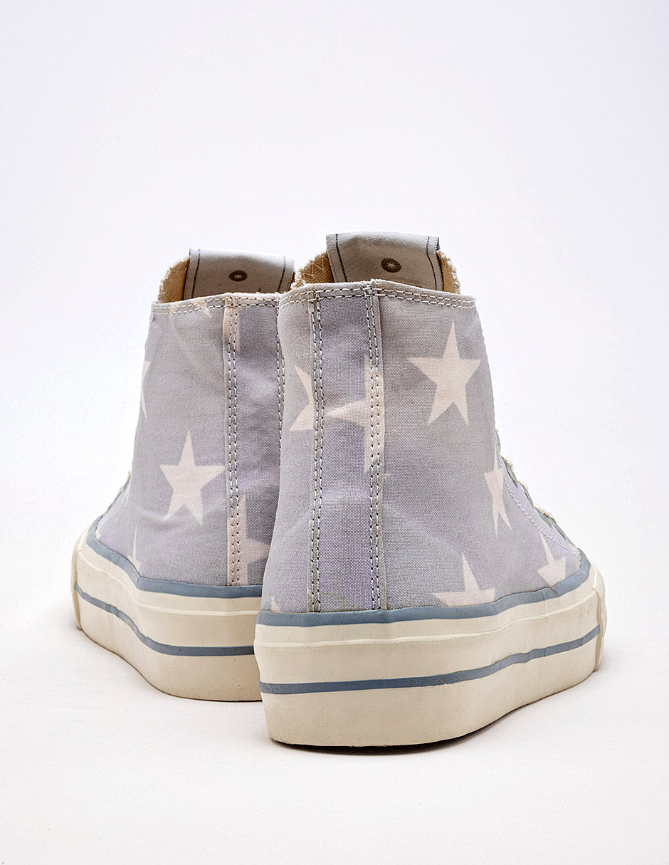La tela de lona del tenis es de un color gris claro con un patrón de estrellas blancas estampadas. La suela es de plataforma, de un color crema. La suela es de plataforma de 4 cm, lo que le da un toque distintivo. Ideal para un estilo urbano y cómodo. Combina muy bien con jeans, faldas y vestidos informales para un look cómodo y a la moda. Horma normal . 4 cm "Tu look, tu plataforma. Sé la estrella de tu propio camino." Corte Textil, Forro Textil, Suela Sintética