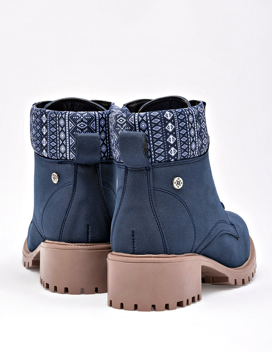 Botines de estilo militar con un diseño de caña media en un llamativo color azul marino. Están confeccionados en un material que simula la gamuza o el nobuk. Los ojales metálicos en tono dorado y los cordones a juego le dan un toque de estilo. En la parte superior de la caña, un detalle de tela con un estampado geométrico en blanco y azul añade un toque original. La suela es de tipo track, de color beige, con un tacón de 6 cm de altura que aporta un estilo moderno y una mayor estabilidad. Son perfectos para los meses de otoño e invierno, ya que se pueden combinar con una amplia variedad de prendas, como jeans ajustados, leggings, vestidos de punto o faldas. Horma normal . "Camina con estilo y personalidad. ¡Elige el color que te define!" Corte Sintético, Forro Textil, Suela Sintética