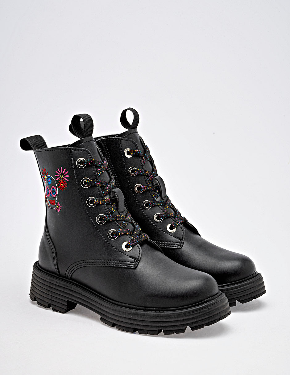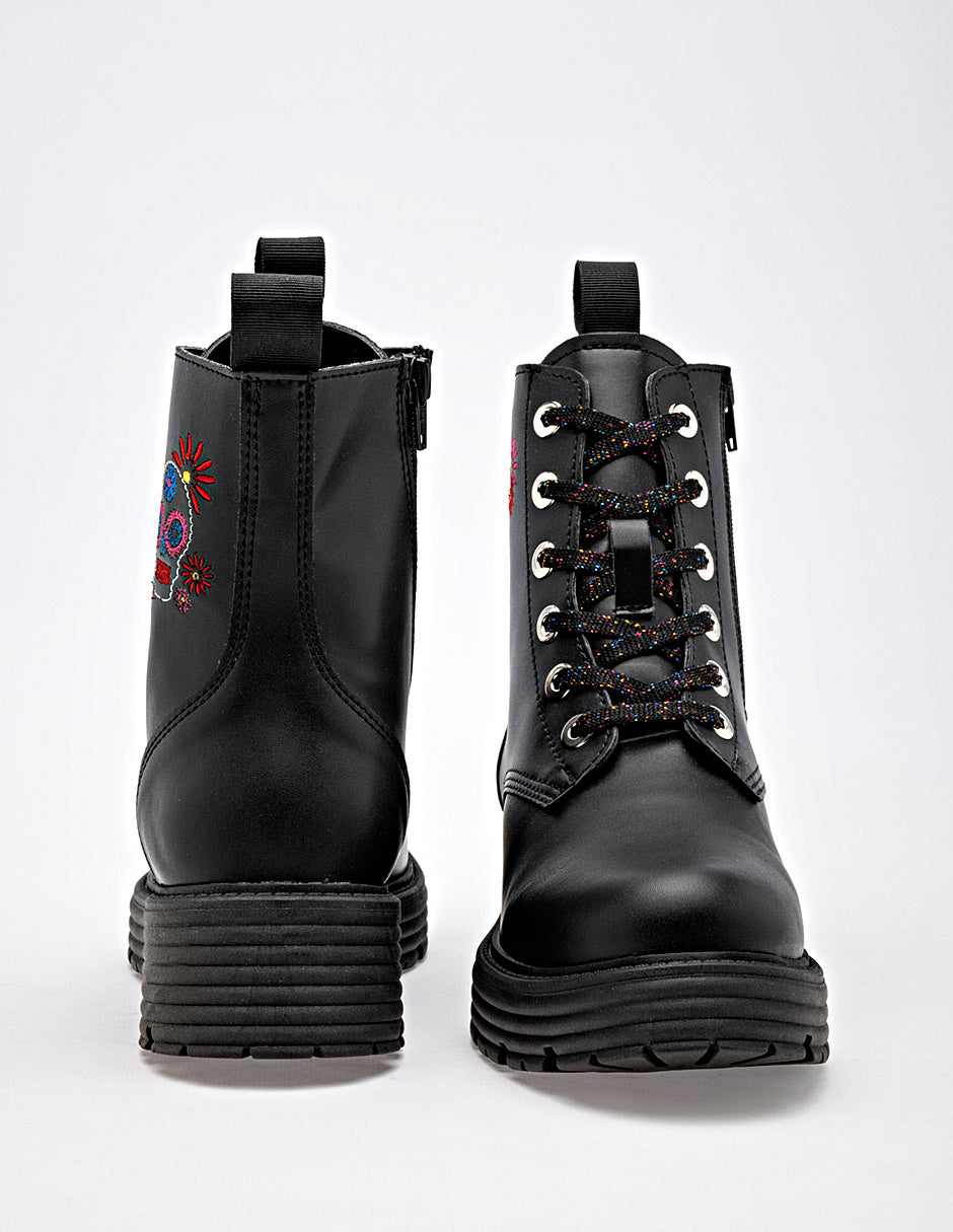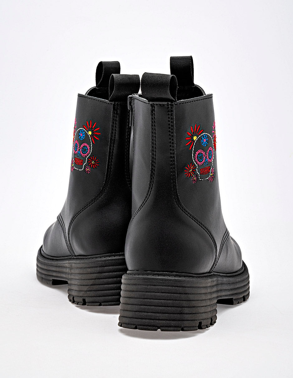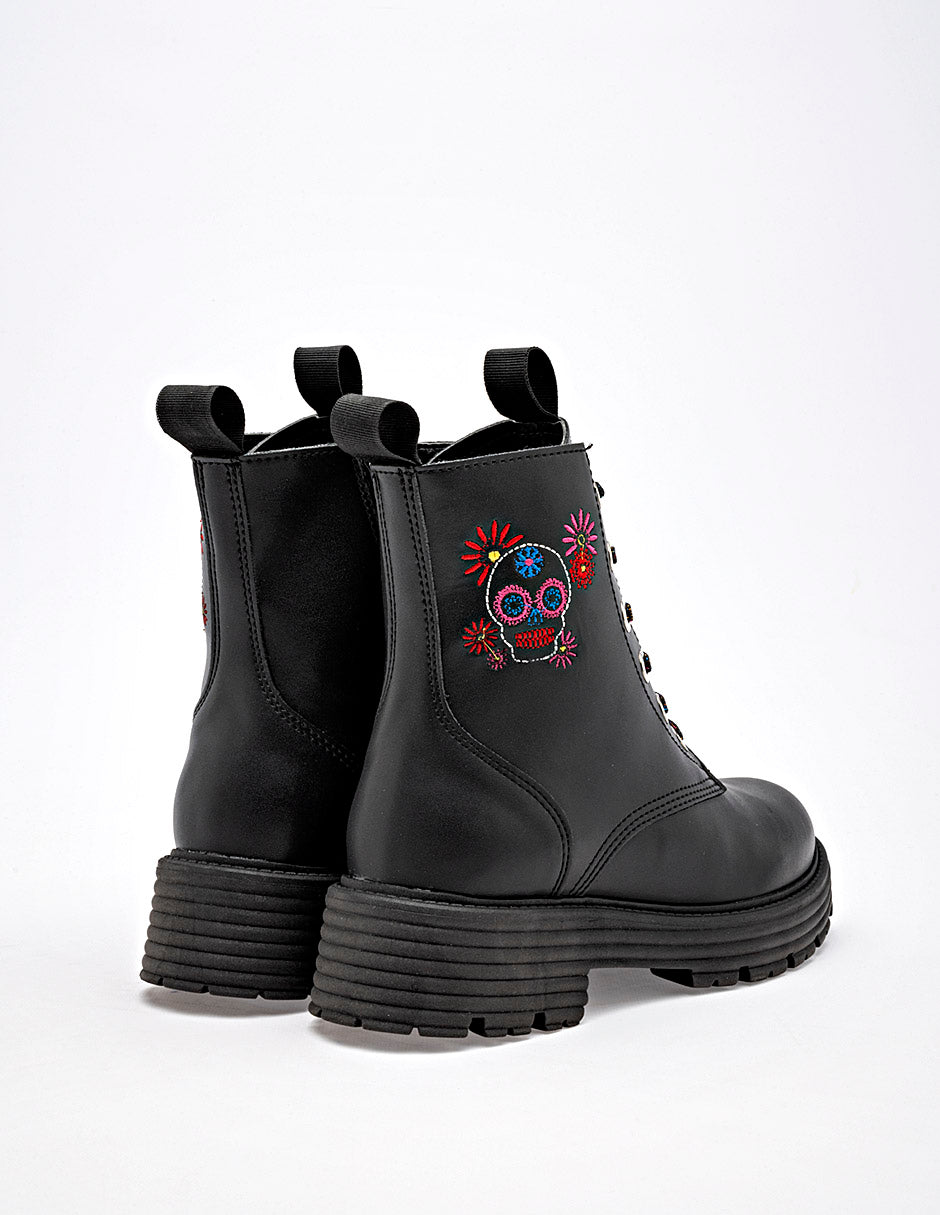 Botas de estilo militar en color negro, con un diseño moderno y un toque de originalidad. Están confeccionadas en un material liso de apariencia de piel. Destacan por un bordado de una calavera de azúcar con flores, en colores vibrantes en el lateral de la caña. Los cordones son multicolor, lo que aporta un contraste llamativo con el color base de la bota. La suela es tipo track, gruesa y con relieve, lo que no solo sigue la tendencia actual sino que también ofrece un excelente agarre. Su diseño único las hace perfectas para los meses de otoño e invierno, combinando muy bien con jeans, leggings, faldas o vestidos, y chaquetas de cuero Horma normal . "El estilo que desafía lo convencional. ¡Camina con arte, camina con fuerza!" Corte Sintético, Forro Textil, Suela Sintética