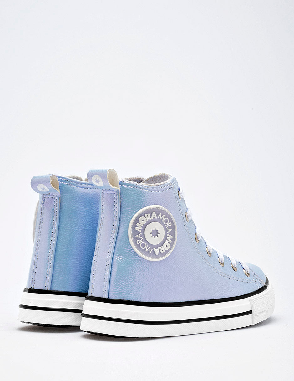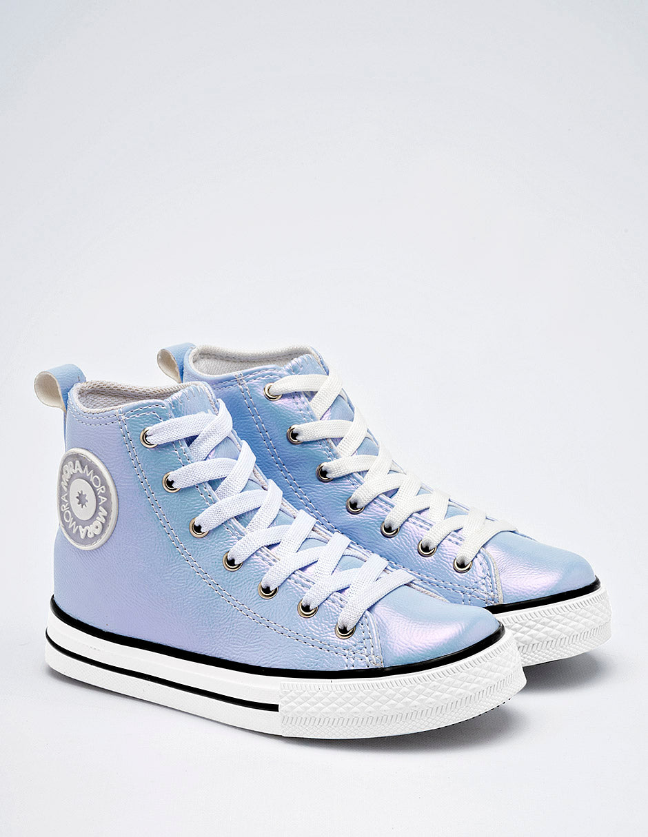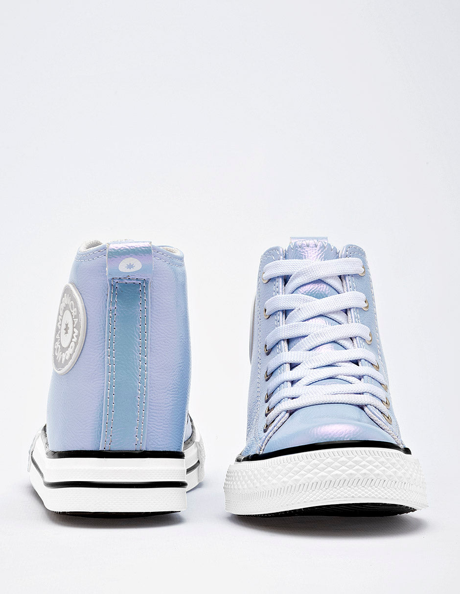 Confeccionados en un llamativo material sintético con un acabado iridiscente en tonos morados y azules claros, capturan la luz de manera encantadora, asegurando que brillen con cada paso. El diseño clásico de corte alto ofrece un soporte adicional al tobillo, mientras que los cordones planos blancos permiten un ajuste seguro y personalizado. Cuentan con una suela de goma , que proporciona excelente tracción y durabilidad. Perfectas para combinar con jeans, faldas o vestidos, estos tenis son ideales para niñas que aman destacar y expresar su personalidad a través de su calzado. Horma normal . "Donde la moda encuentra la fantasía. ¡Sus nuevos tenis iridiscentes!" Corte Sintético, Forro Textil, Suela Sintética