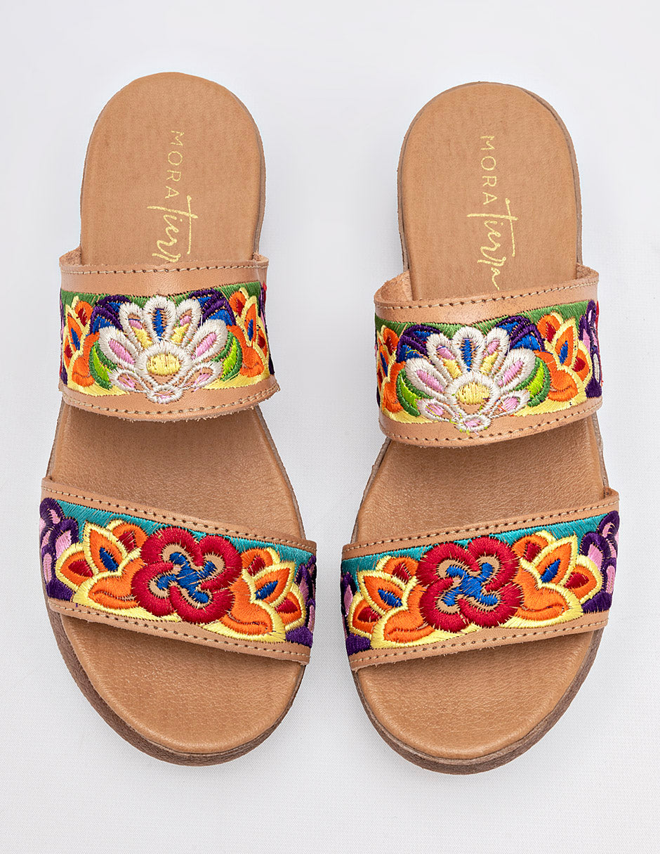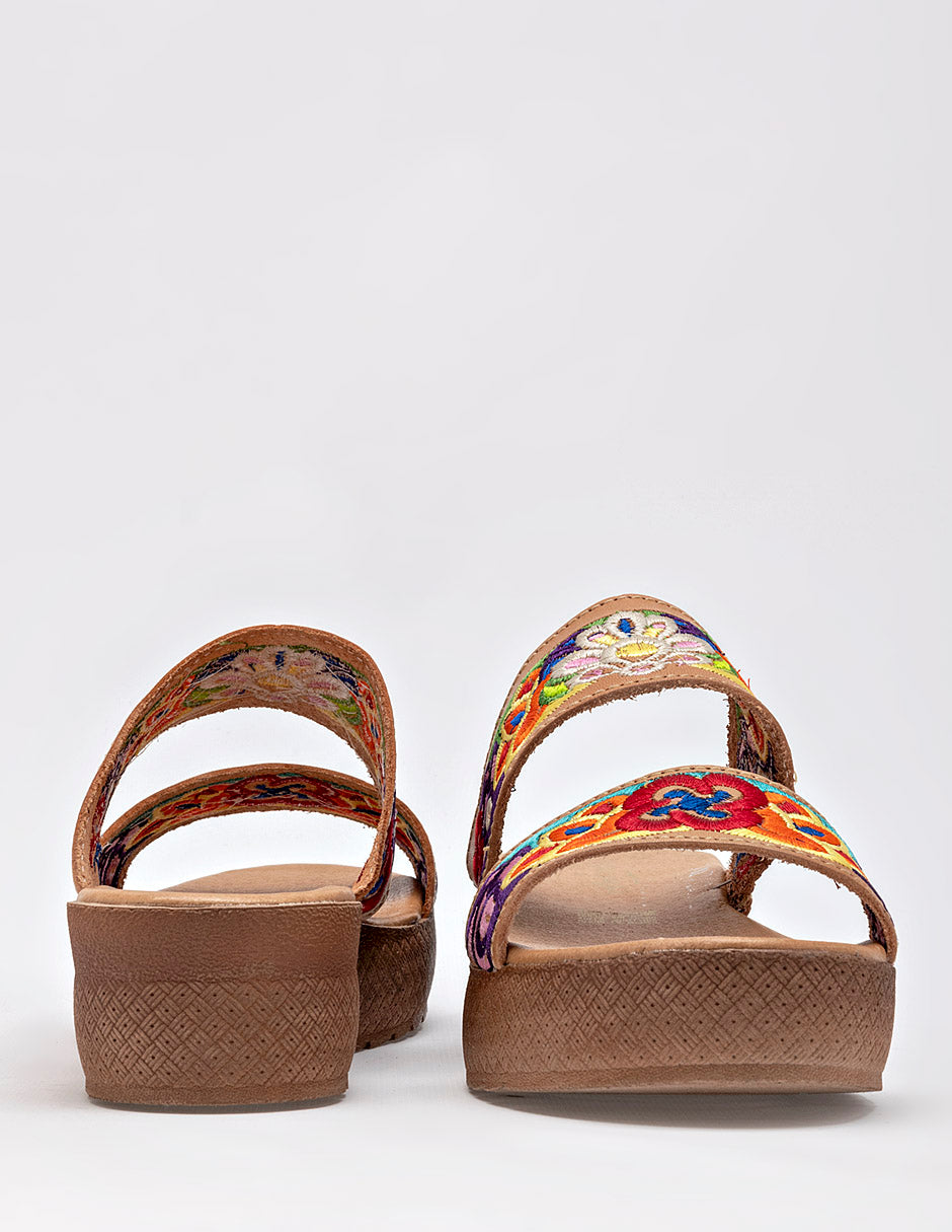 Sandalia con un diseño que destaca por su artesanía. Están confeccionadas en un material de piel lisa. La parte superior está compuesta por dos tiras anchas adornadas con un bordado multicolor de estilo floral y bohemio, que aporta un toque de originalidad y color. La suela es de plataforma, con un tacón de 4 cm de altura, lo que estiliza la figura sin sacrificar comodidad. Combinan muy bien con vestidos de estilo hippie-chic, faldas largas, pantalones de lino o shorts. Son adecuadas para paseos por la ciudad, comidas al aire libre, festivales o cualquier evento informal. Horma normal . "El arte y la tradición en cada paso. ¡Comodidad y estilo que florecen en tu camino!"Corte Piel, Suela Sintética