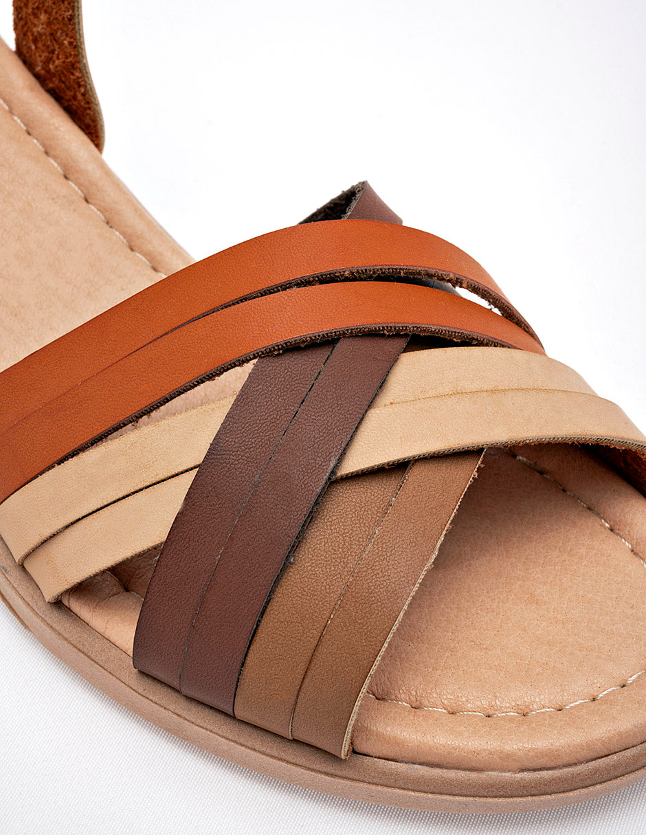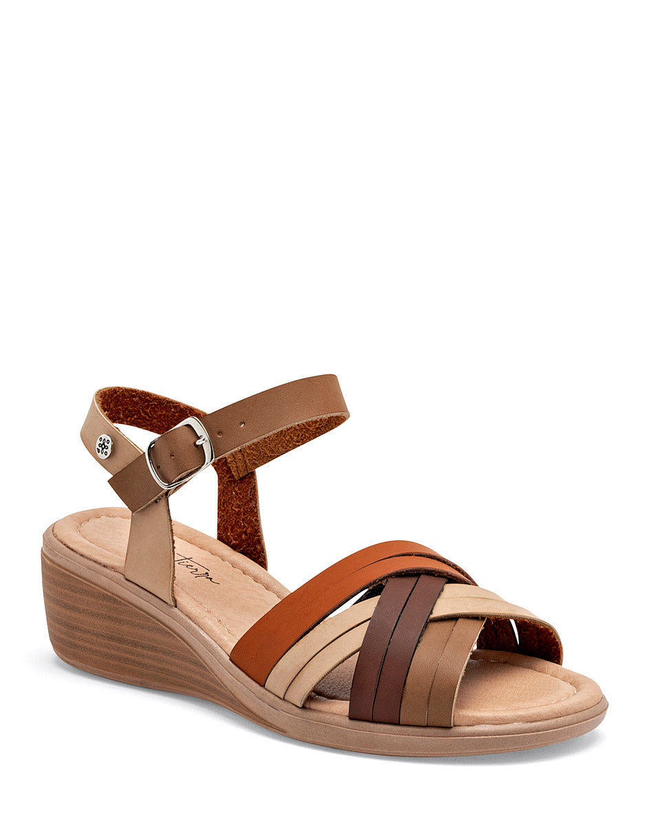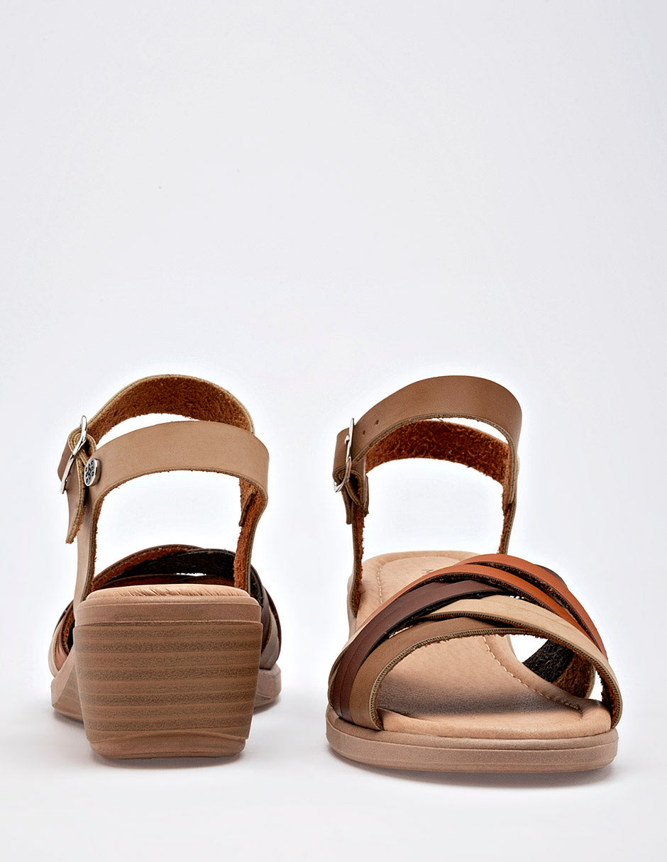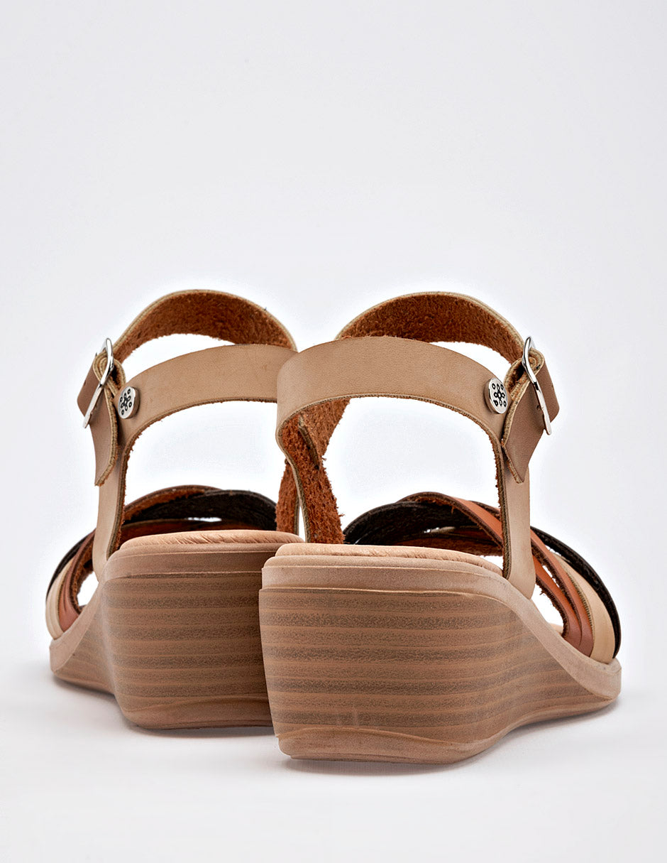 Sandalia de cuña con un diseño de tiras cruzadas en la parte delantera. El empeine presenta una combinación de tonos tierra, incluyendo café, beige y marrón oscuro. Tiene un tacón de cuña bajo y una correa ajustable con hebilla metálica alrededor del tobillo para un ajuste seguro y cómodo.