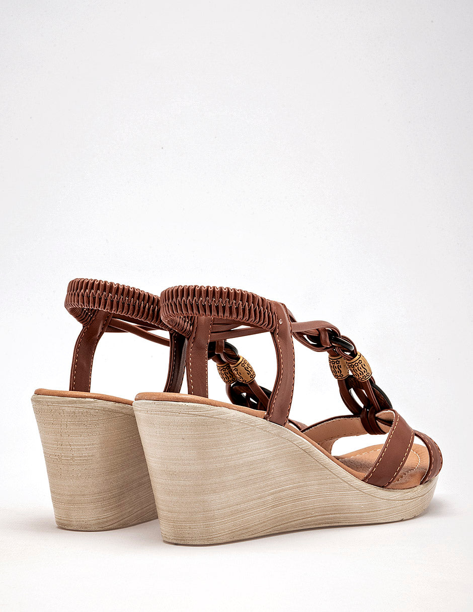 Sandalia de cuña para mujer con un tacón de 7 cm. Presenta un diseño de tiras en color café claro que se entrelazan sobre el empeine, adornado con detalles circulares tipo madera y una pieza metálica dorada. Cuenta con una banda elástica en el talón para un ajuste cómodo y seguro. La suela de cuña tiene un acabado que imita la madera clara. Son ideales para combinar con vestidos largos o faldas de estilo bohemio, pantalones capri o shorts, creando un look fresco y femenino. Horma normal . 7 cm "Eleva tu estilo con la frescura del verano. ¡Comodidad y elegancia en cada paso!" Corte Sintético, Forro Sintético, Suela Sintética