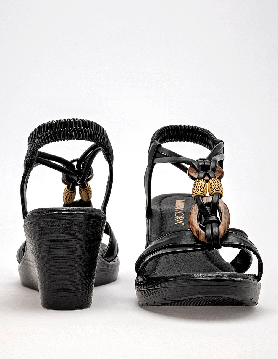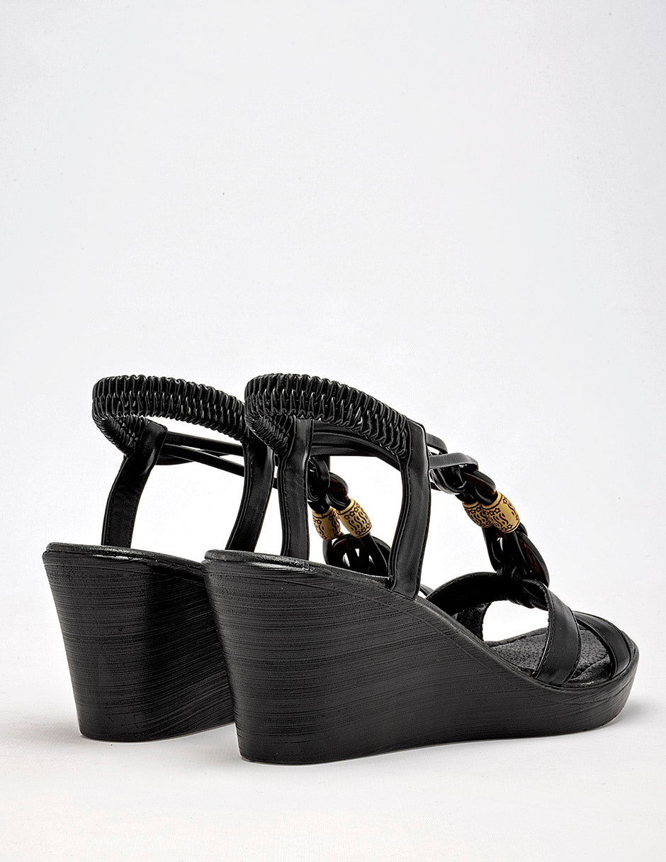 Sandalias de cuña en un tono negro, con un diseño que evoca un estilo bohemio y natural. La suela, tipo cuña, mide aproximadamente 7 cm y presenta un acabado que simula la madera clara, lo que aporta un toque de elegancia y altura. La parte superior está compuesta por tiras de un material liso de apariencia de piel, entrelazadas en la parte central y adornadas con un detalle en color dorado que simula una pieza de artesanía. La tira del tobillo es elástica y se adapta al pie para un calce cómodo y seguro.Son ideales para combinar con vestidos largos o faldas de estilo bohemio, pantalones capri o shorts, creando un look fresco y femenino. Horma normal . "Eleva tu estilo con la frescura del verano. ¡Comodidad y elegancia en cada paso!" Corte Sintético, Forro Sintético, Suela Sintética