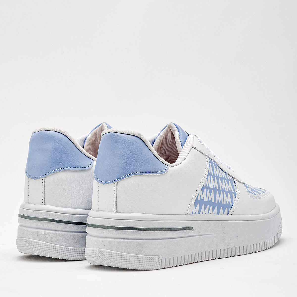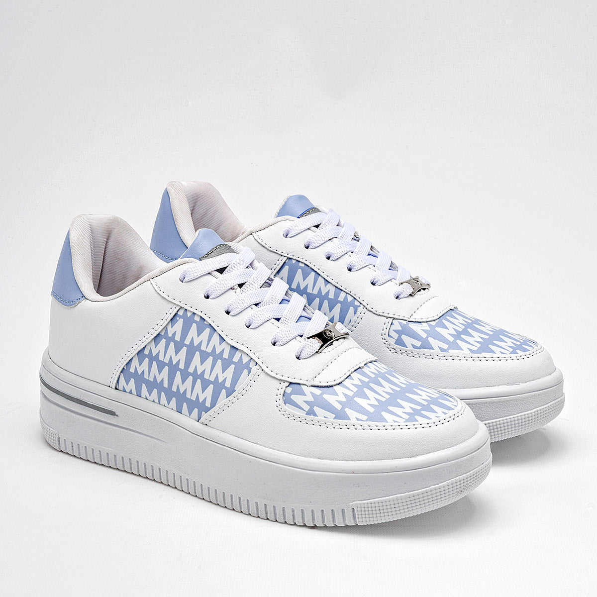 Presenta paneles con un patrón repetitivo de letras "M" o un monograma en el tono azul claro, lo que le da un toque distintivo y de marca. Cuenta con una plataforma gruesa y robusta su tacón es de 4 cm, lo que le da una elevación sutil y estiliza la figura. Ideal para complementar atuendos modernos como jeans, pantalones deportivos, shorts o incluso vestidos y faldas casuales para un look desenfadado pero con estilo. Horma normal . "El sello de tu personalidad. Diseño único, altura con actitud." Corte Sintético, Forro Textil, Suela Sintética