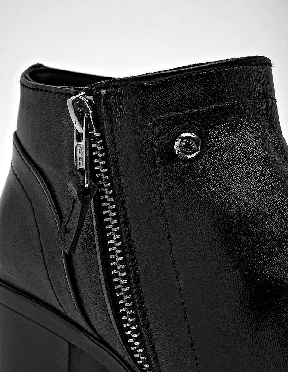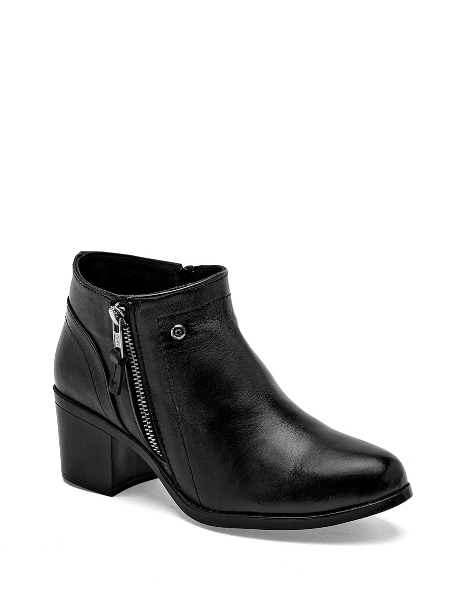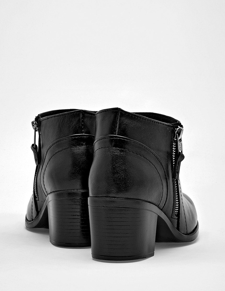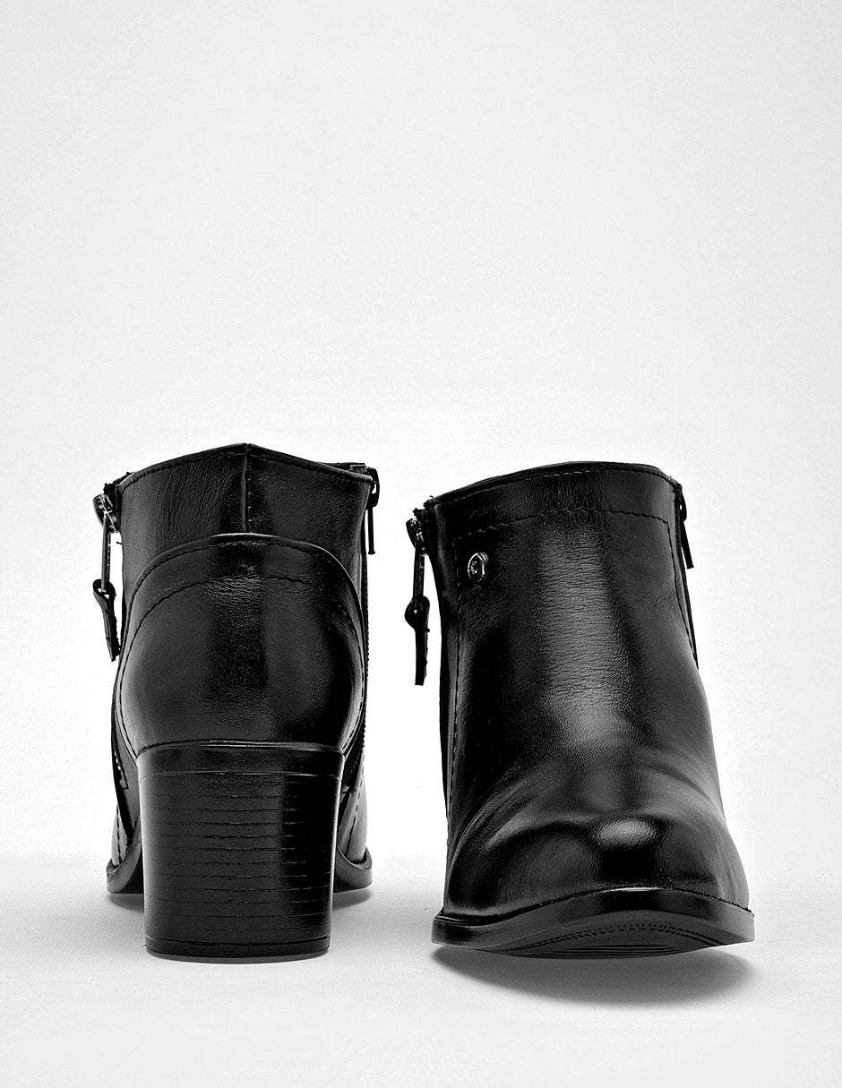 Se trata de un botín con un acabado en piel que le confiere un aspecto elegante y de alta calidad. El diseño es clásico y versátil, ideal para diversas ocasiones. Cuenta con una cremallera lateral de color plateado, que no solo es funcional, sino que también añade un detalle de estilo. Tacón robusto y ancho, de 6 cm de altura, lo que proporciona estabilidad y confort al caminar.