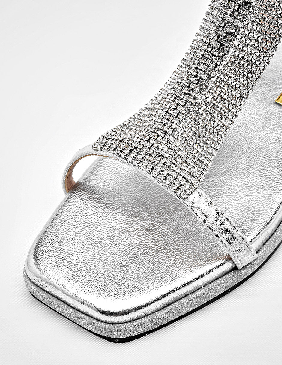 Sandalia plana para mujer en color plata, con un acabado brillante. El diseño se distingue por una tira delgada en el empeine, adornada con una cascada de cadena plata. Cuenta con una tira trasera ajustable al tobillo, que le da un ajuste seguro y un toque de glamour.