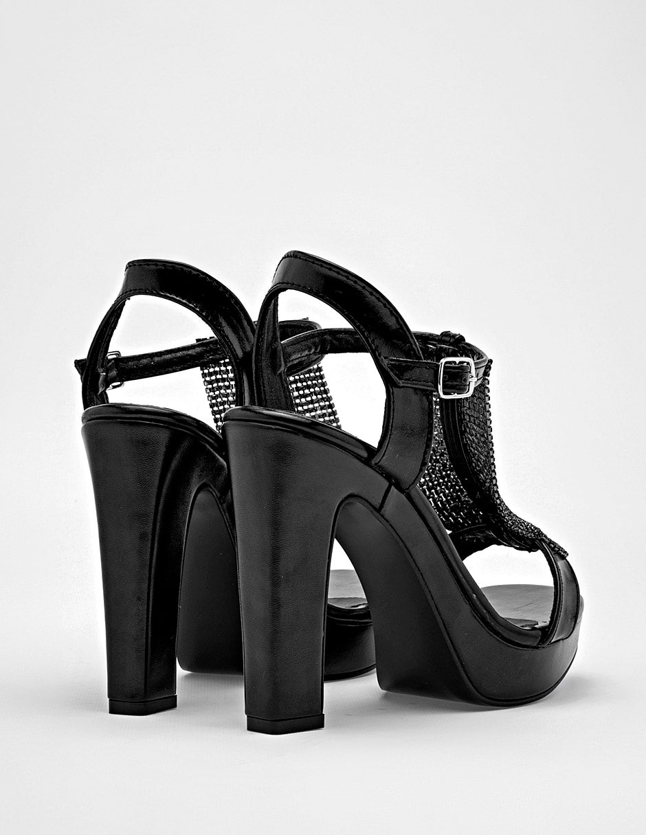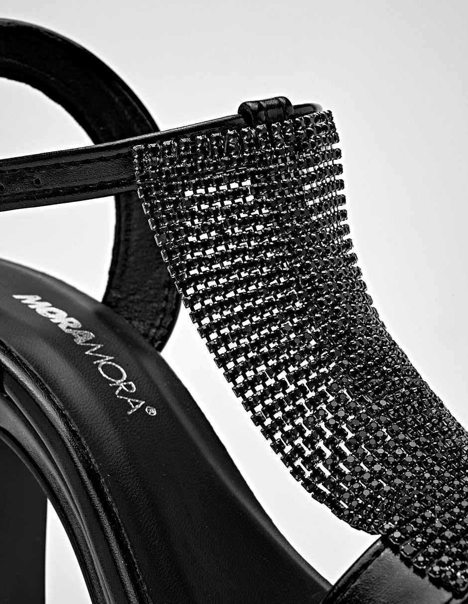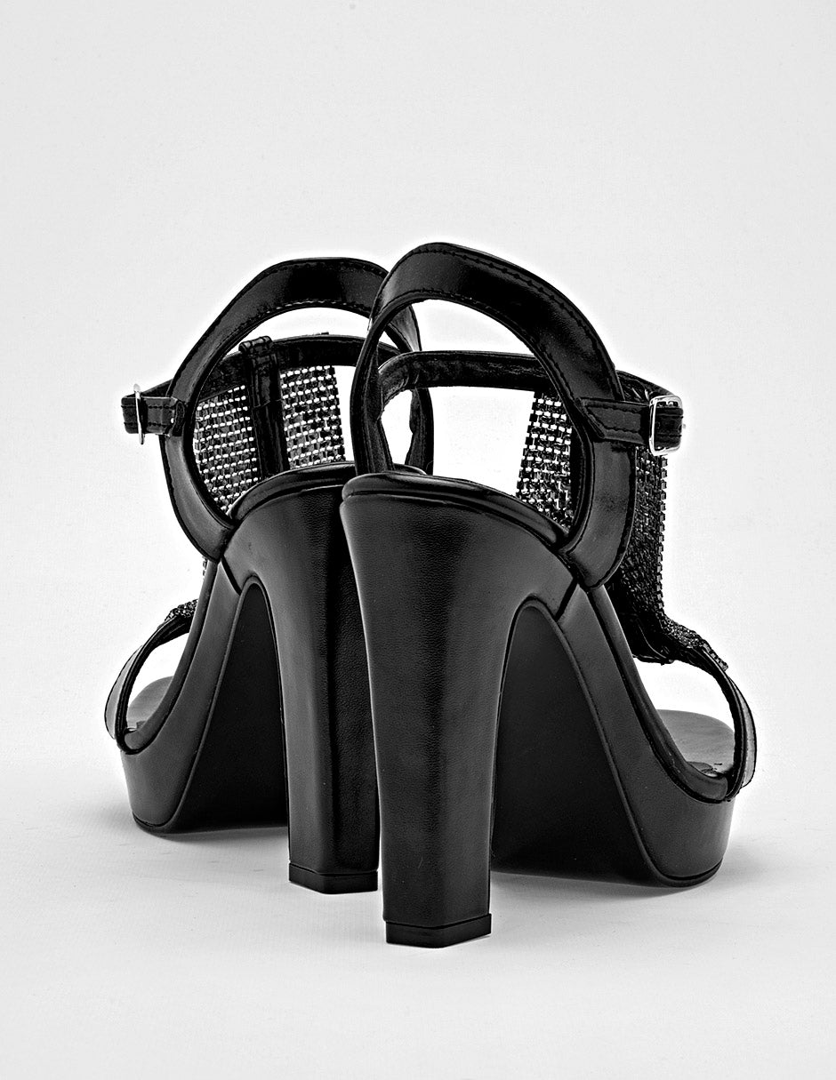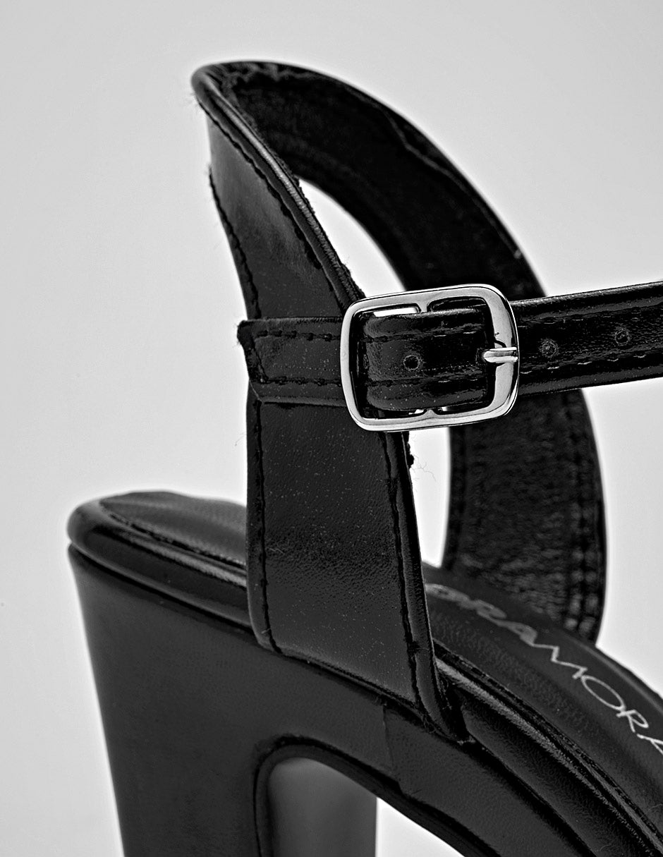 Zapatilla de tacón para mujer en color negro, con una plataforma delantera y un tacón ancho de 11 cm . El diseño se distingue por una cascada de cadena negra sobre el empeine y una tira ajustable al tobillo, que le dan un toque moderno y audaz.