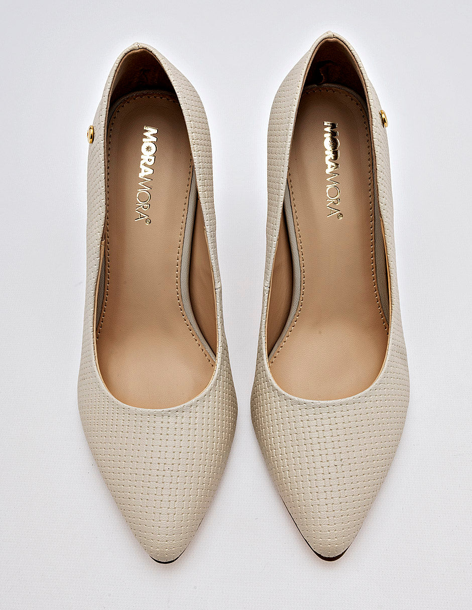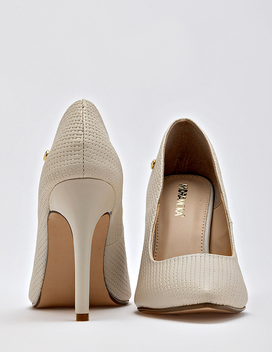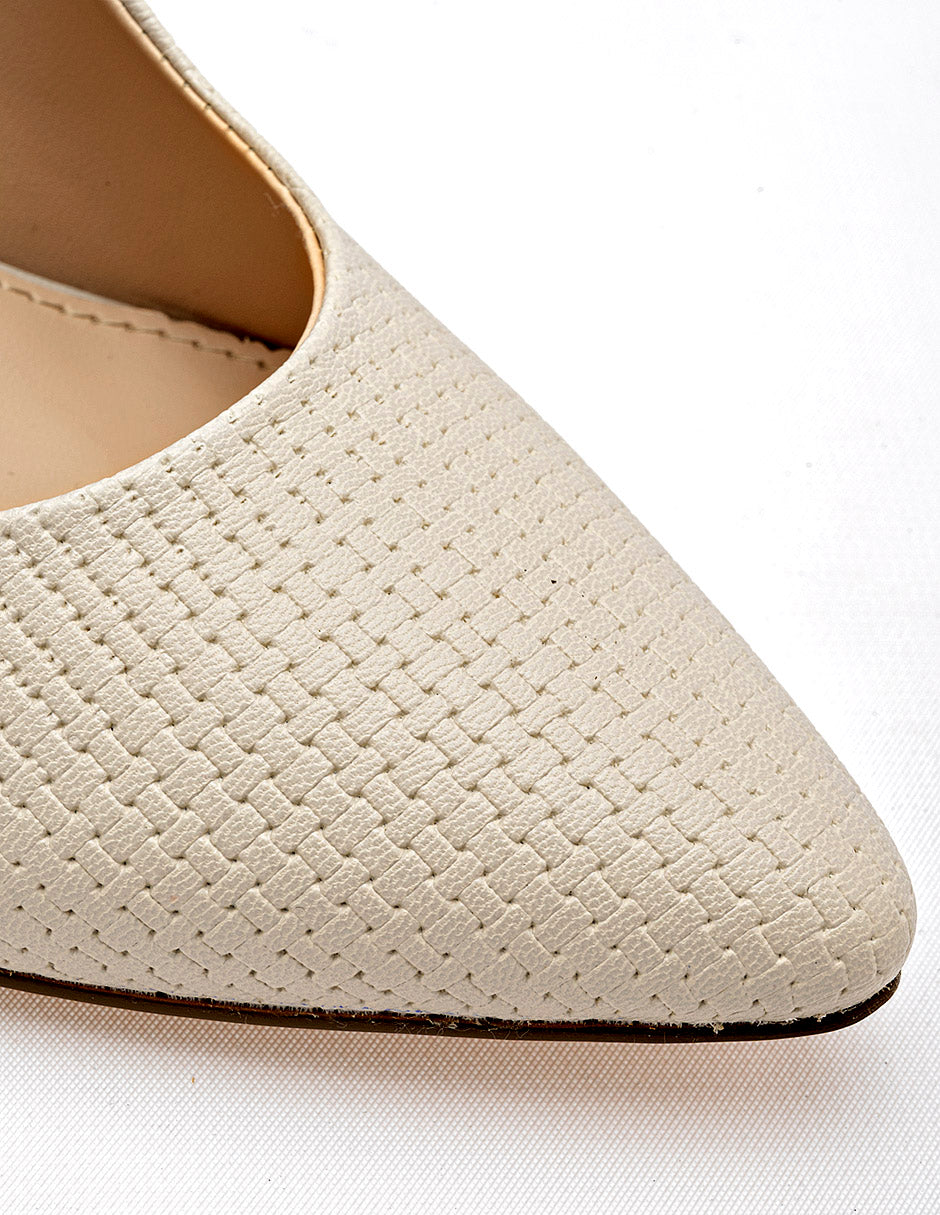 Zapato de tacón tipo salón para mujer, en color blanco roto o hueso con una sutil textura. Presenta una punta afilada y un tacón de aguja de 10 cm. Cuenta con un detalle metálico en el lateral y un diseño clásico y elegante.