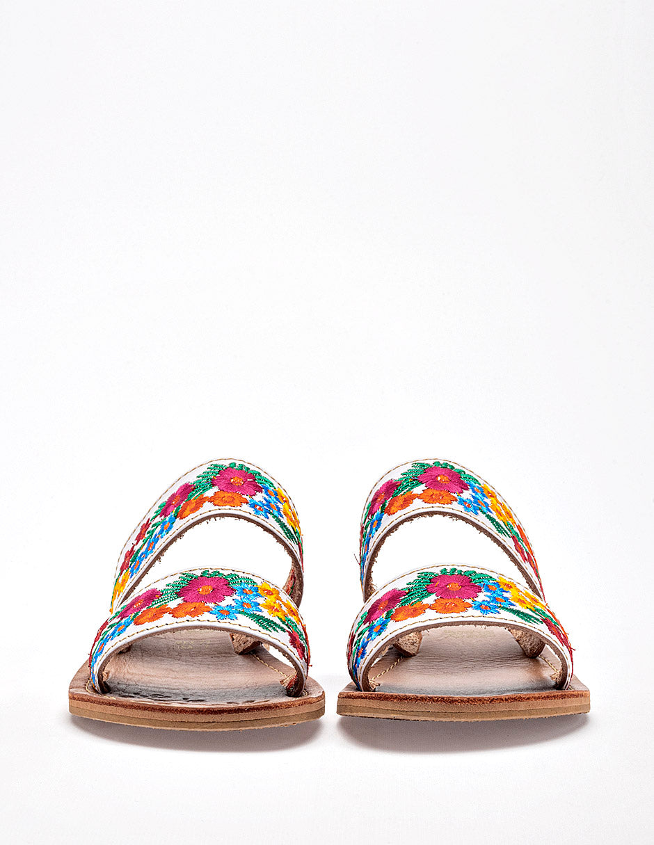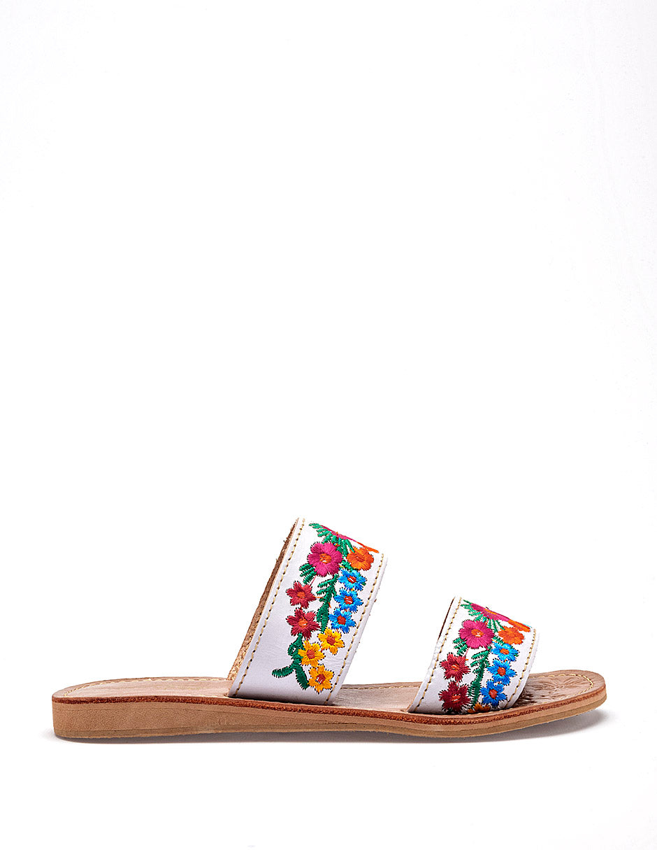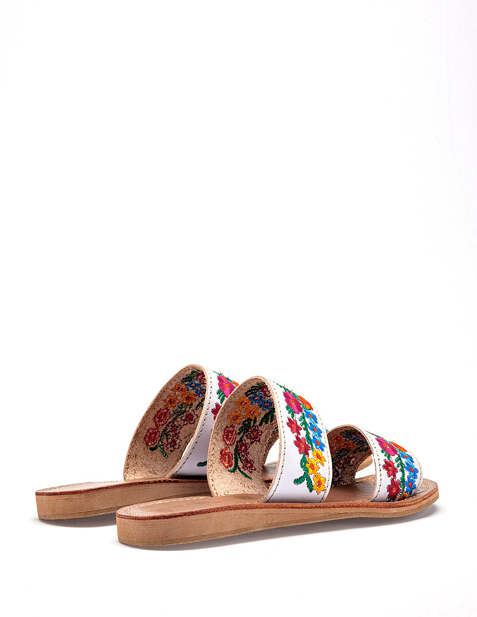 Sandalia plana tipo slide de estilo artesanal y colorido, que destaca por su diseño tradicional y femenino. Presenta un diseño de dos bandas horizontales independientes confeccionadas en un material de color blanco. Ambas bandas están decoradas con bordados florales multicolores densos y detallados, que incluyen flores en tonos fucsia, naranja, amarillo y azul, acompañadas de follaje verde. Posee una suela extra plana de color beige claro con un borde sutilmente elevado para mayor durabilidad.