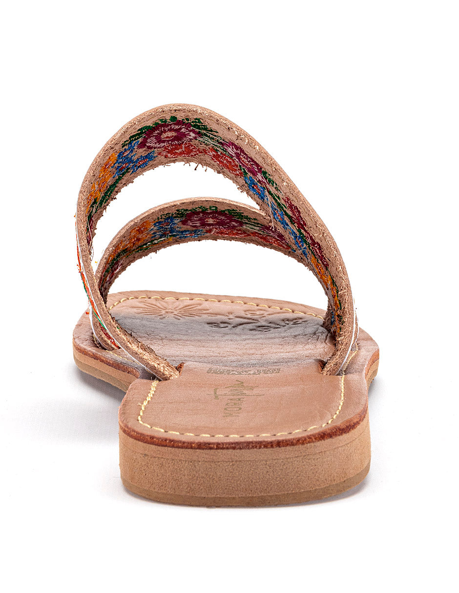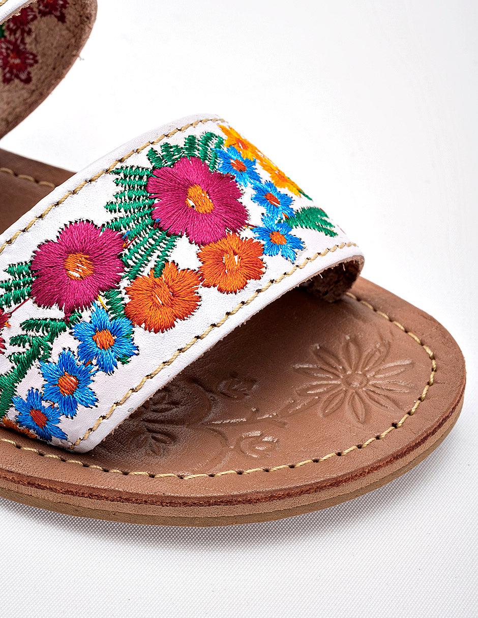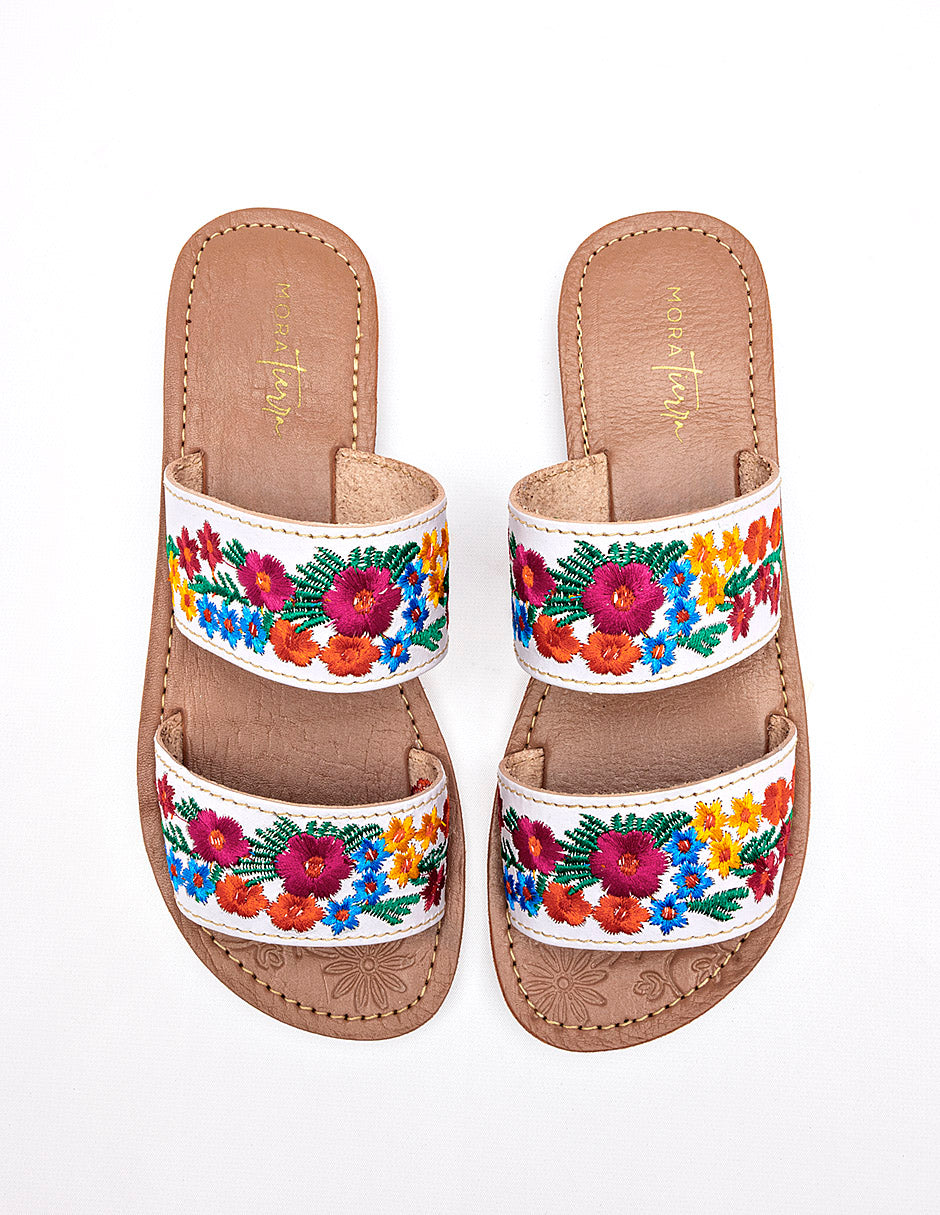 Sandalia plana tipo slide de estilo artesanal y colorido, que destaca por su diseño tradicional y femenino. Presenta un diseño de dos bandas horizontales independientes confeccionadas en un material de color blanco. Ambas bandas están decoradas con bordados florales multicolores densos y detallados, que incluyen flores en tonos fucsia, naranja, amarillo y azul, acompañadas de follaje verde. Posee una suela extra plana de color beige claro con un borde sutilmente elevado para mayor durabilidad.