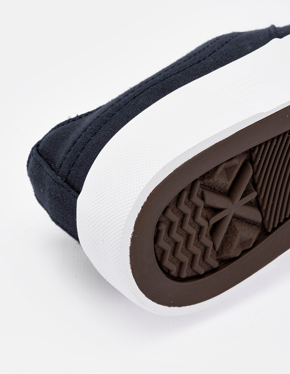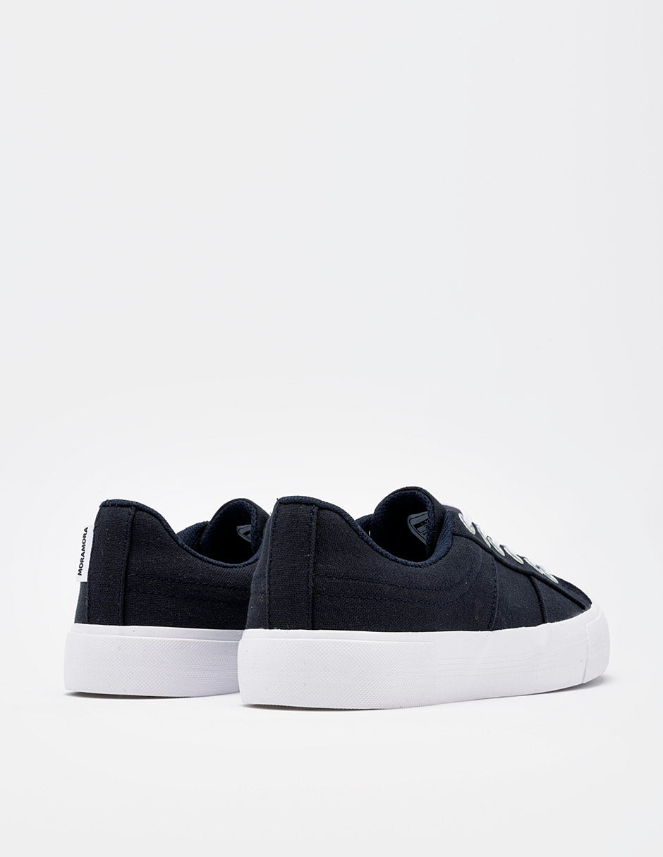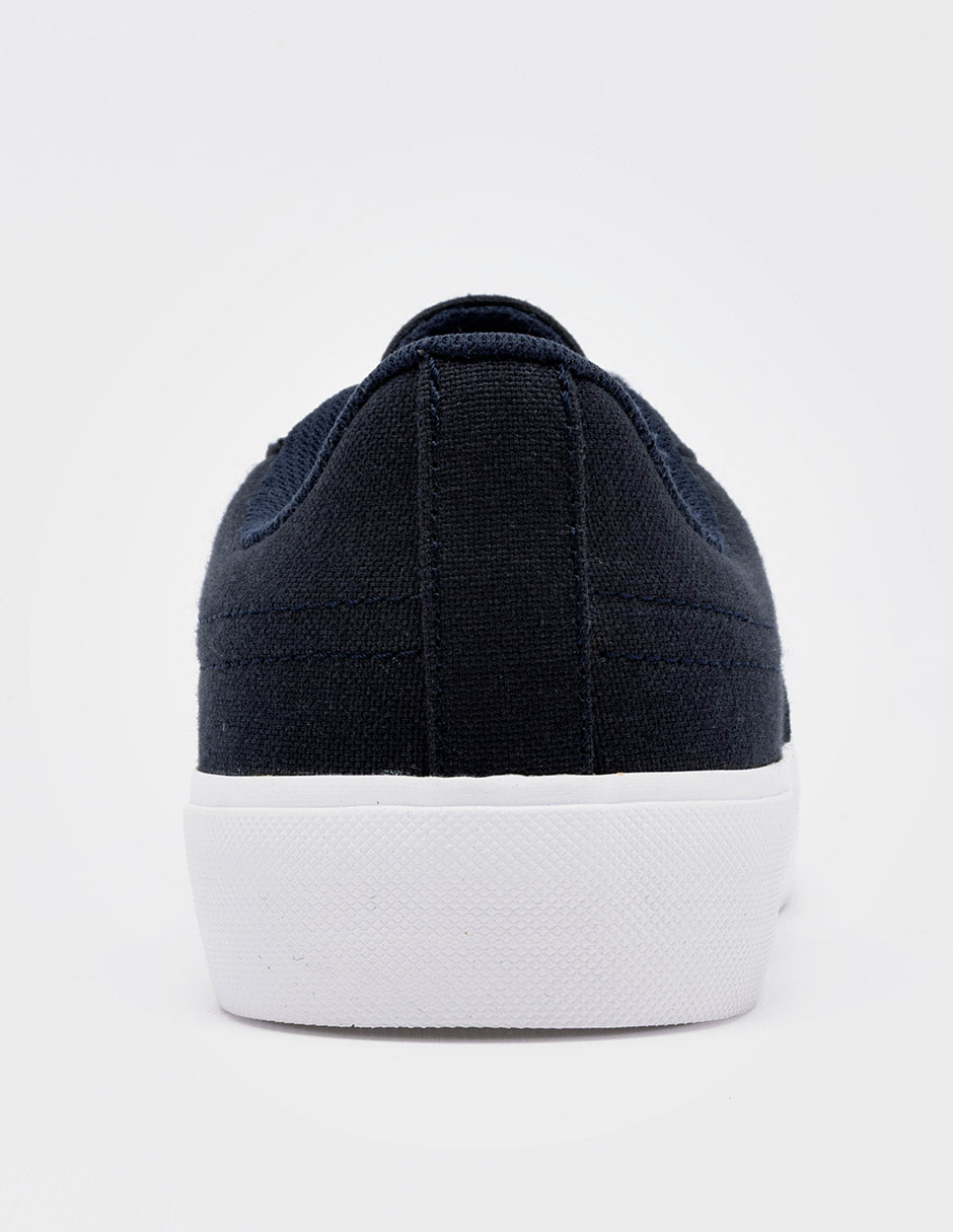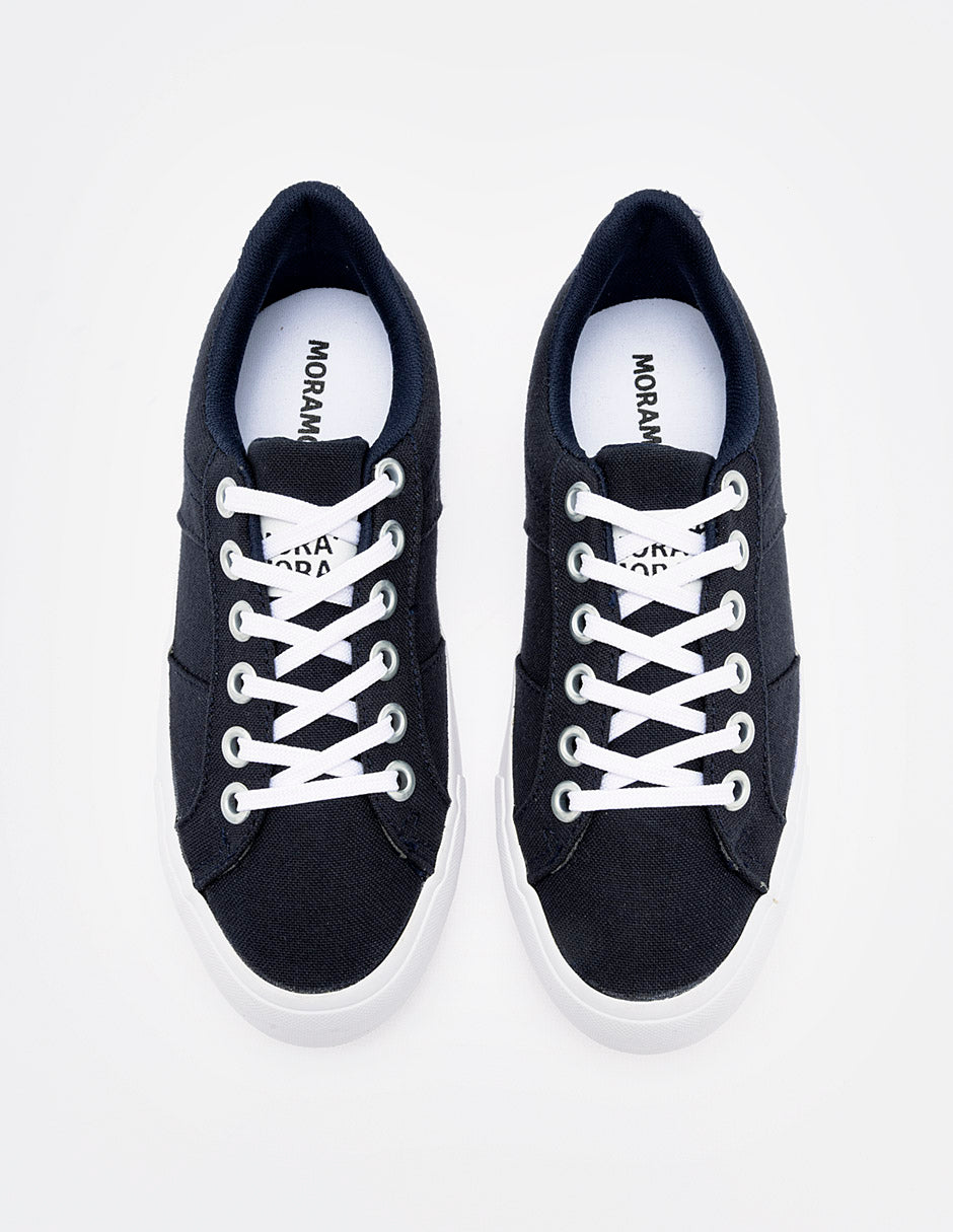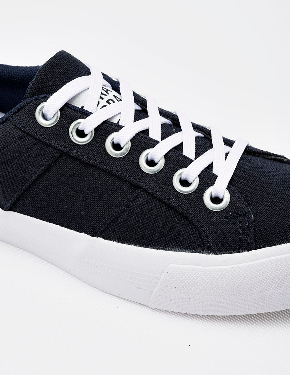 Tenis casual de silueta baja confeccionado en lona de color azul marino profundo. Presenta un diseño limpio con costuras reforzadas en los laterales y ojales metálicos plateados que resaltan sobre el tejido. Cuenta con una suela de goma blanca vulcanizada de perfil medio y cordones planos blancos que ofrecen un contraste clásico y atemporal.