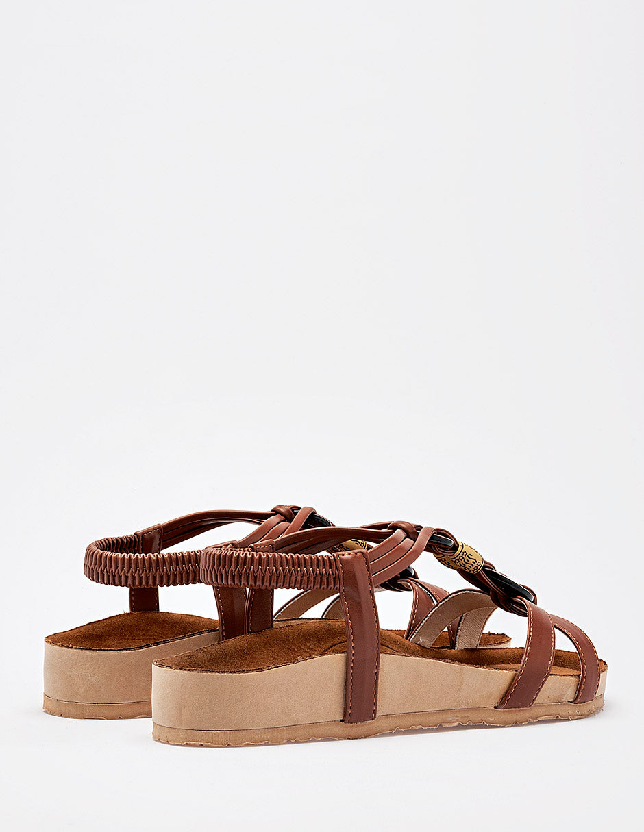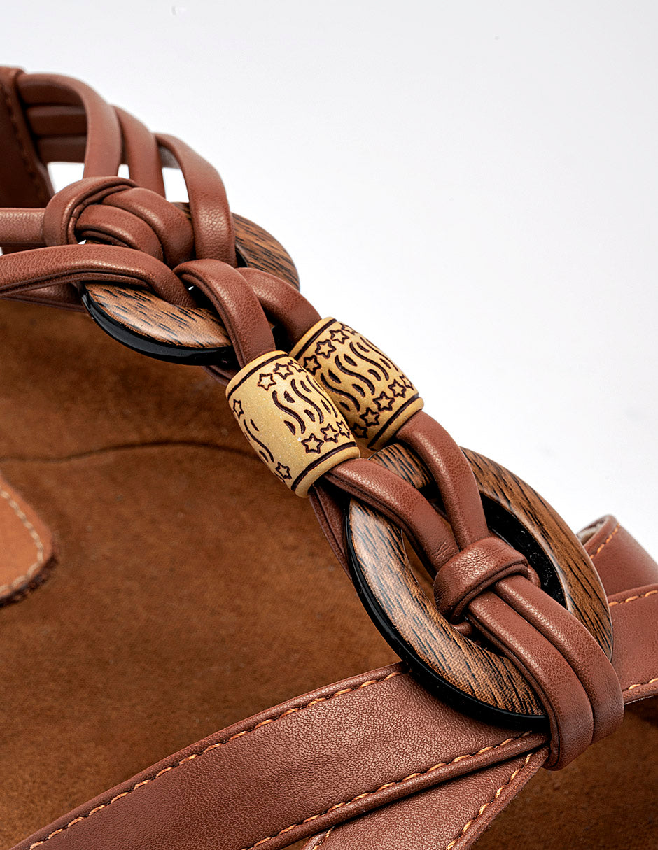 Sandalia plana de estilo confort con diseño de tiras Confeccionada en material sintético de color café tabaco. Presenta un diseño de tiras delgadas cruzadas sobre el empeine que convergen en un detalle central decorativo. En la parte frontal, las tiras se entrelazan a través de aros oscuros y una pieza cilíndrica con grabado étnico en tonos tierra, aportando un toque artesanal.