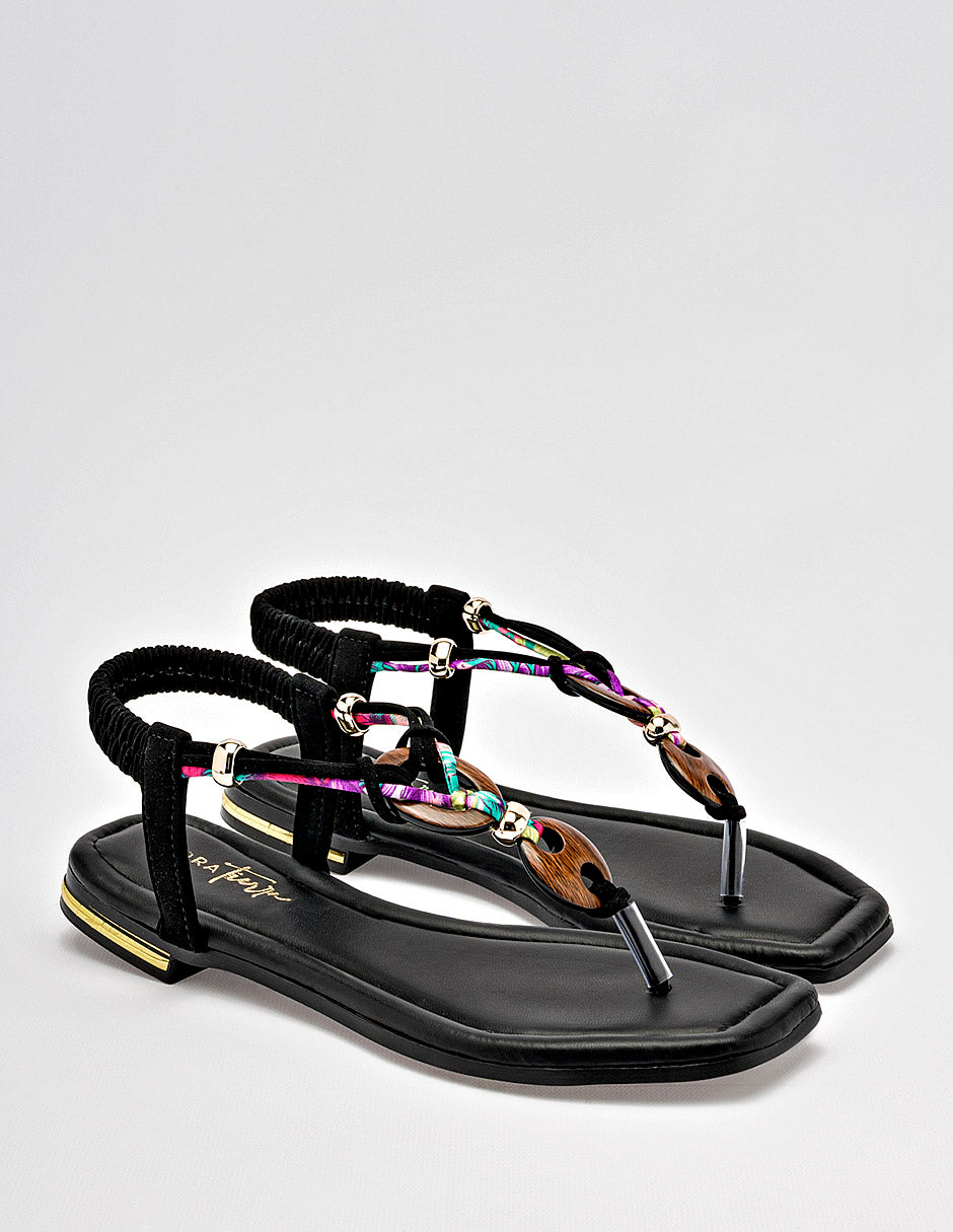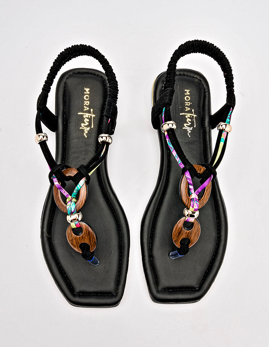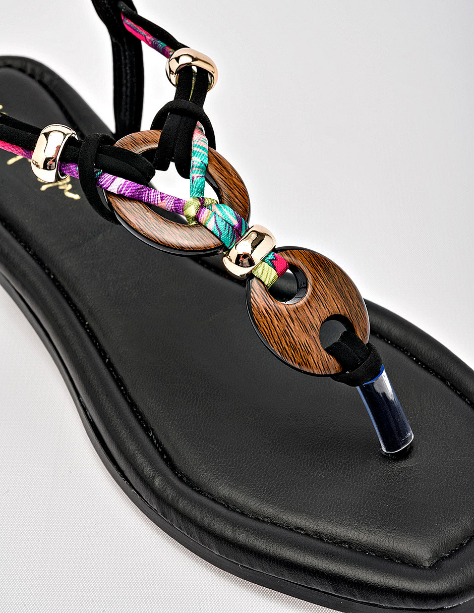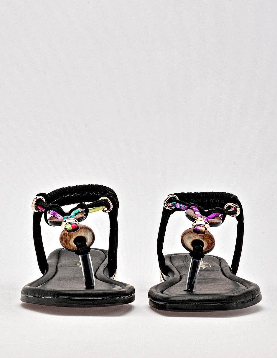 Sandalia plana tipo "thong" (de dedo) que combina un diseño minimalista con elementos artesanales y toques de color, Presenta una estructura de tiras delgadas en material sintético de color negro. La tira central que recorre el empeine está decorada con piezas de madera oscura en forma de aros y óvalos, entrelazadas con cordones de colores vibrantes y pequeñas esferas metálicas doradas.