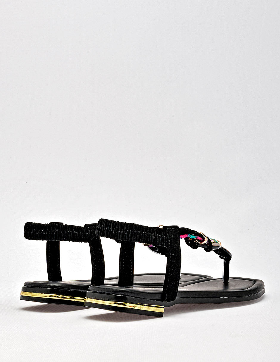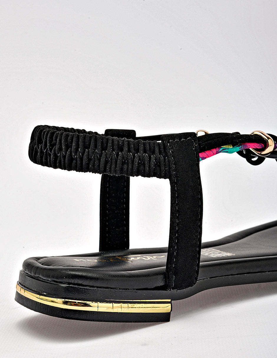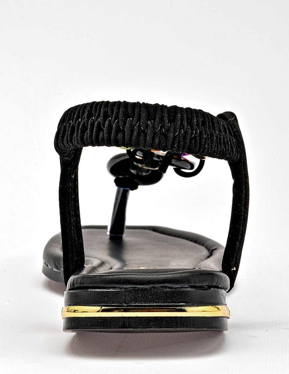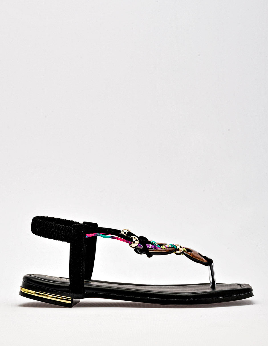 Sandalia plana tipo "thong" (de dedo) que combina un diseño minimalista con elementos artesanales y toques de color, Presenta una estructura de tiras delgadas en material sintético de color negro. La tira central que recorre el empeine está decorada con piezas de madera oscura en forma de aros y óvalos, entrelazadas con cordones de colores vibrantes y pequeñas esferas metálicas doradas.