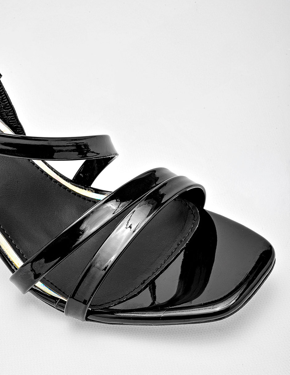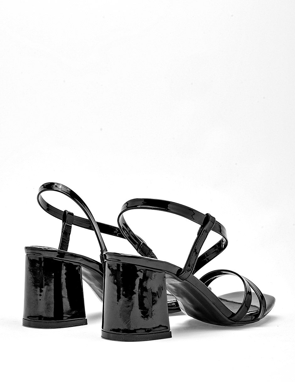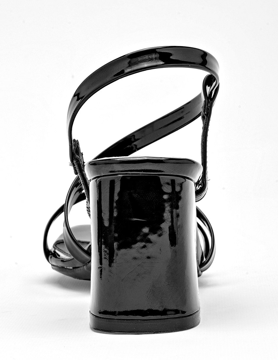 Sandalia de tacón de bloque con una estética minimalista y sofisticada, diseñada para ofrecer elegancia con un toque moderno, Confeccionada en material sintético con un acabado de charol brillante en color negro profundo. Presenta un sistema de tiras delgadas y tubulares que incluyen una banda frontal sobre los dedos y tiras que se cruzan diagonalmente sobre el empeine, conectando con un soporte tipo slingback en el talón.
