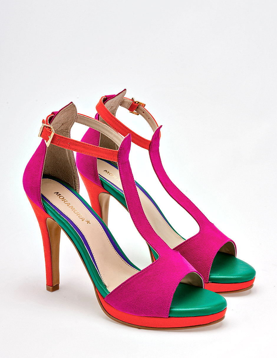 Sandalia de tacón alto y plataforma que destaca por su vibrante diseño color-block y su silueta estilizada, Presenta una elegante estructura en "T" confeccionada en material textil tipo gamuza de color fucsia intenso. El diseño juega con una paleta audaz que incluye un talón y tacón en color naranja vibrante, mientras que la plantilla y el borde interior son de un verde esmeralda contrastante.