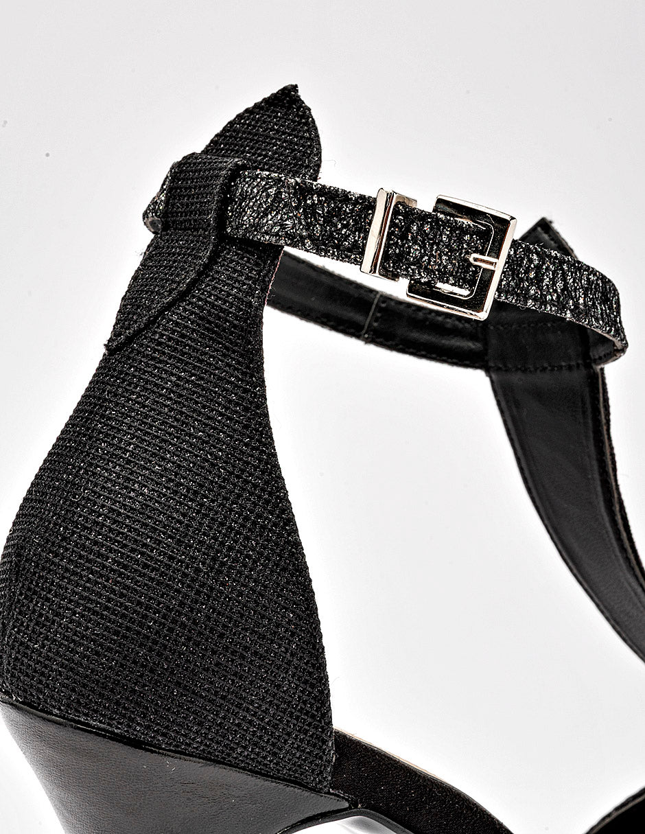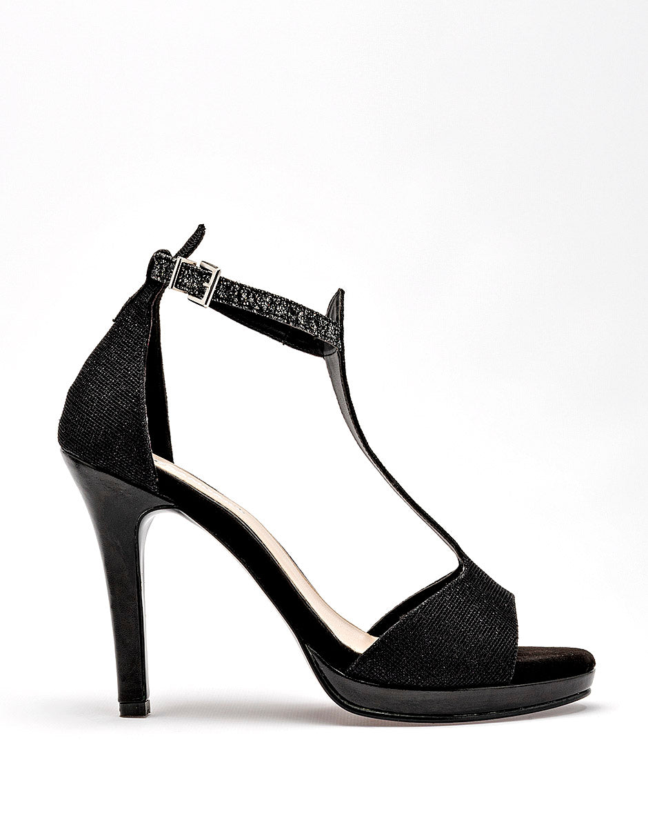 Sandalia de tacón alto con plataforma delantera, diseñada con una silueta clásica y detalles de brillo que aportan sofisticación, Presenta una elegante estructura en "T" confeccionada en material textil de color negro con acabado de micro-brillos (glitter fino) que le da una textura sutilmente luminosa. Posee una fina correa al tobillo con una hebilla metálica plateada, permitiendo un ajuste seguro y delicado que estiliza la pierna.