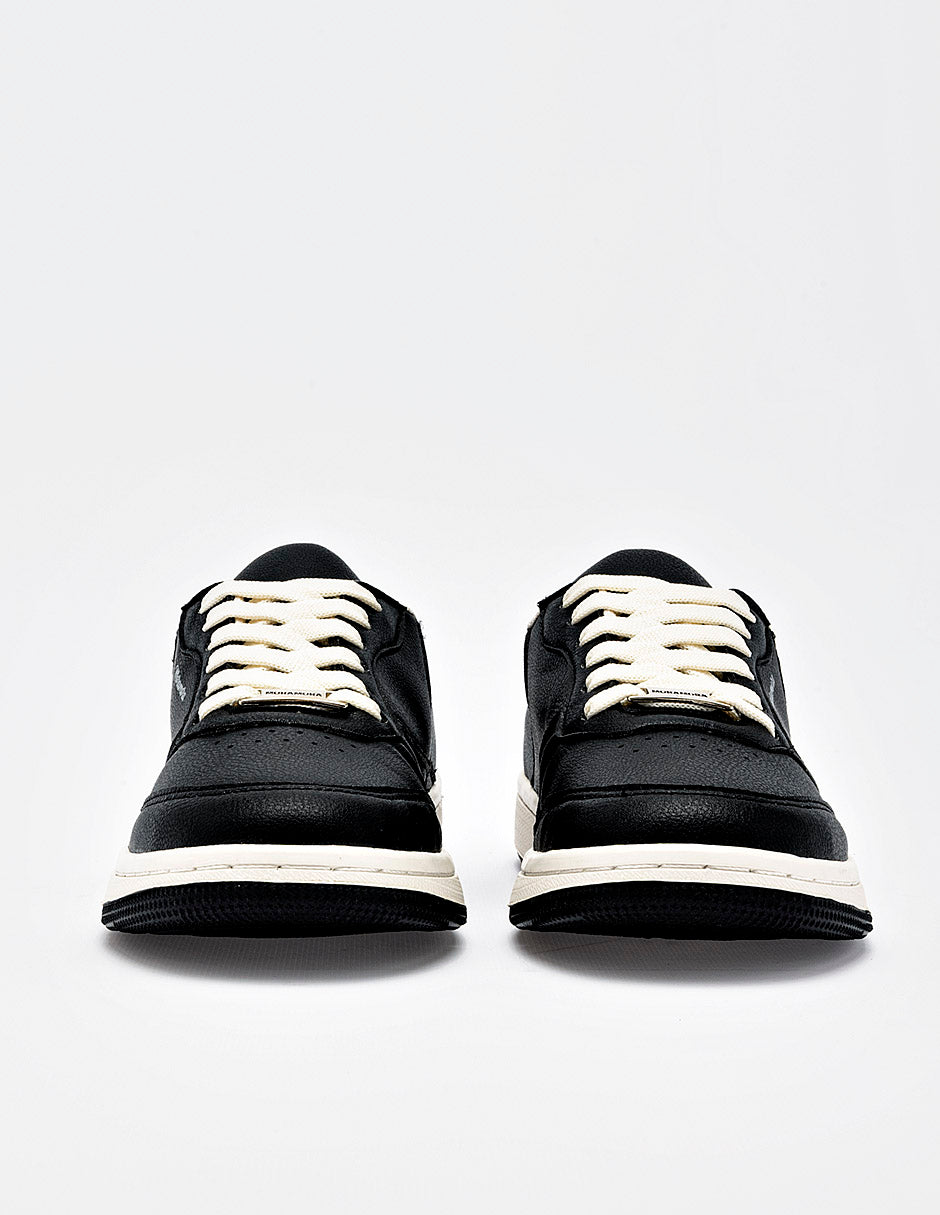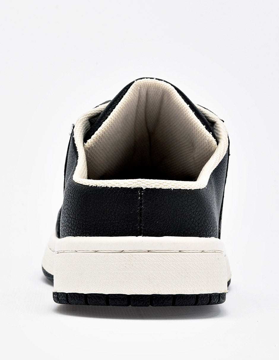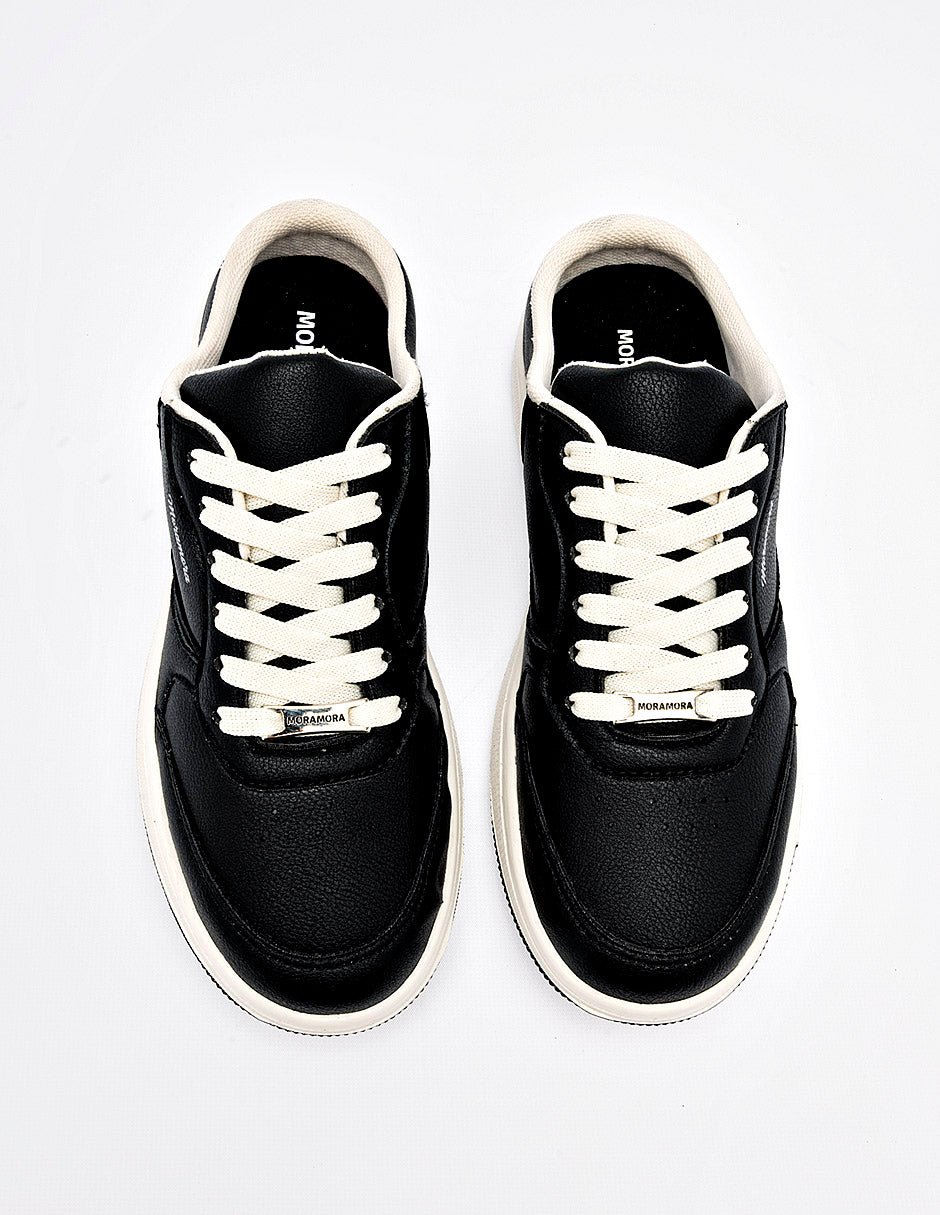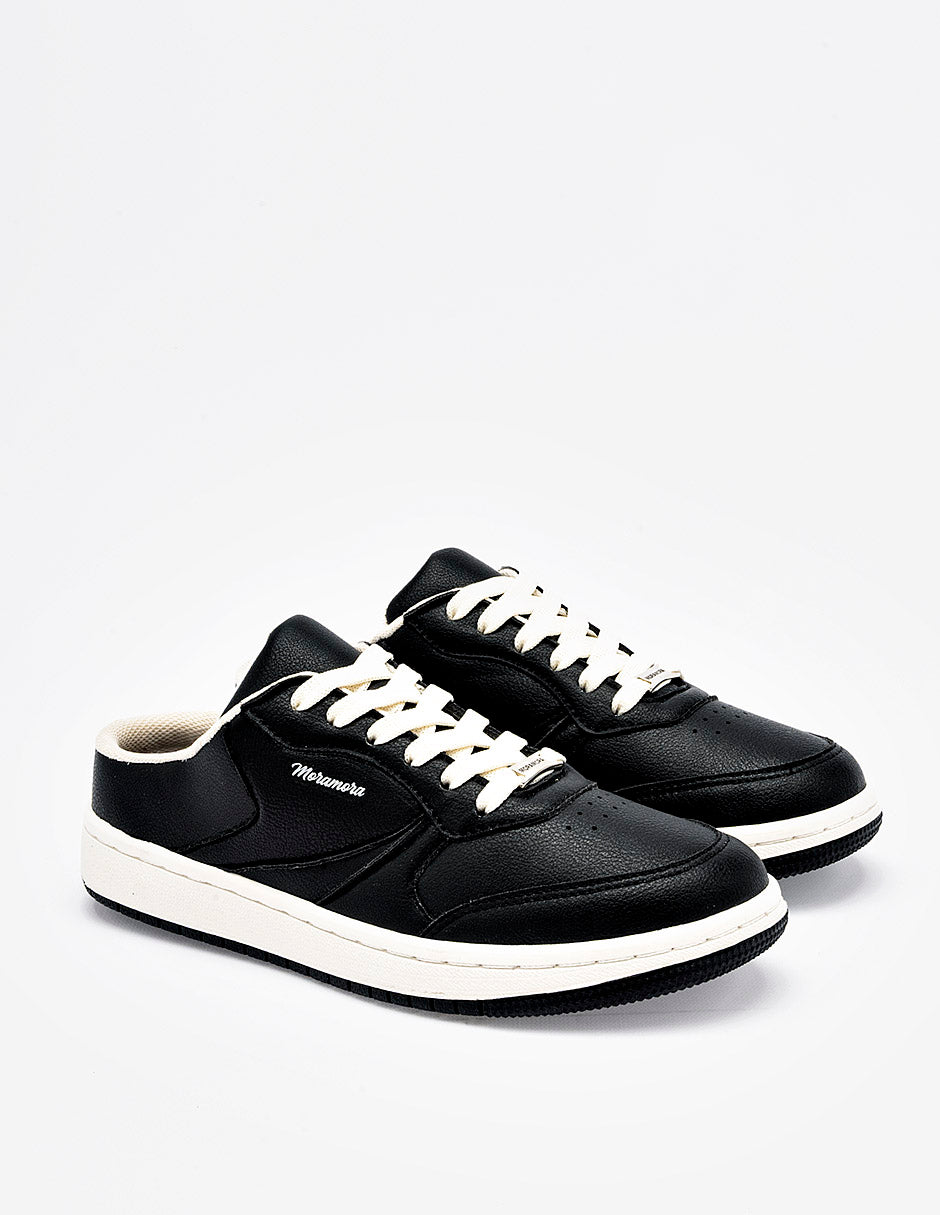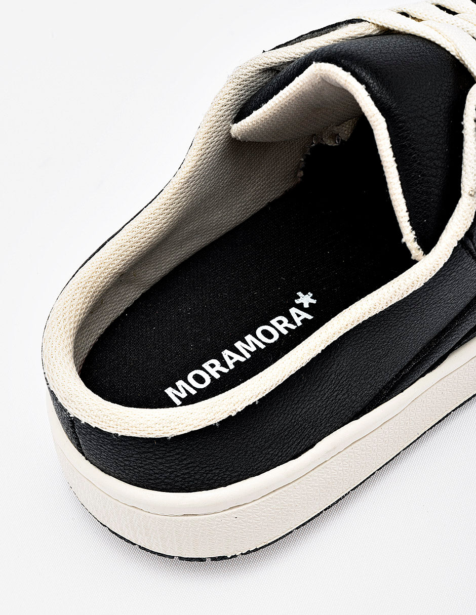 Tenis tipo "mule" o destalonado diseñado íntegramente en color negro con un acabado en piel sintética texturizada. El calzado destaca por su silueta de fácil calce, manteniendo la estética de un tenis urbano tradicional en la parte frontal con cordones blancos a contraste y puntera microperforada. Presenta el logotipo "MoraMora" en el lateral y se asienta sobre una suela plana tipo "cupsole" blanca con base negra, ofreciendo un diseño funcional y moderno.
