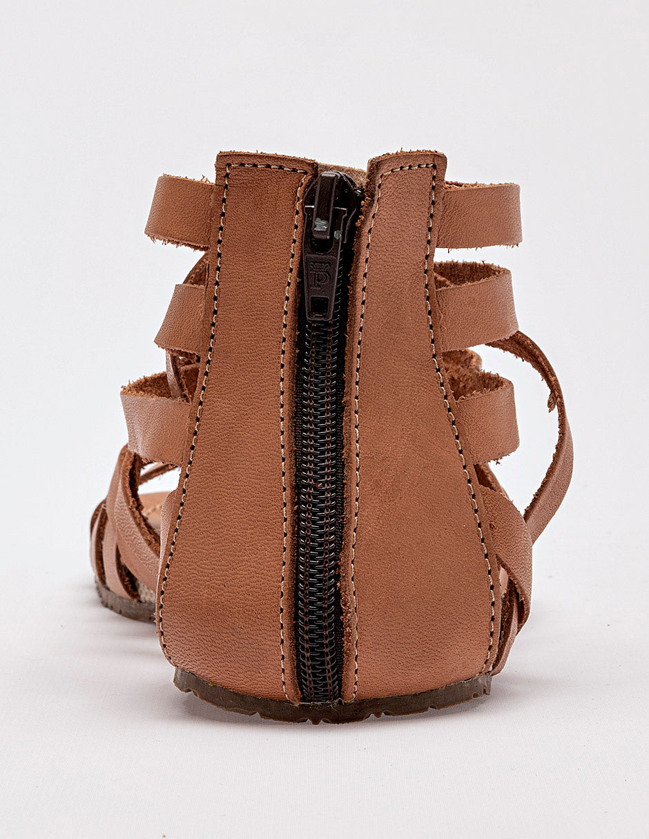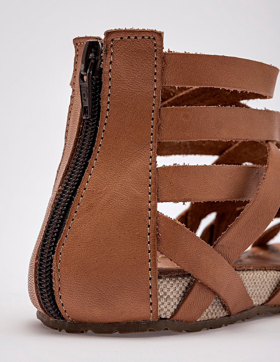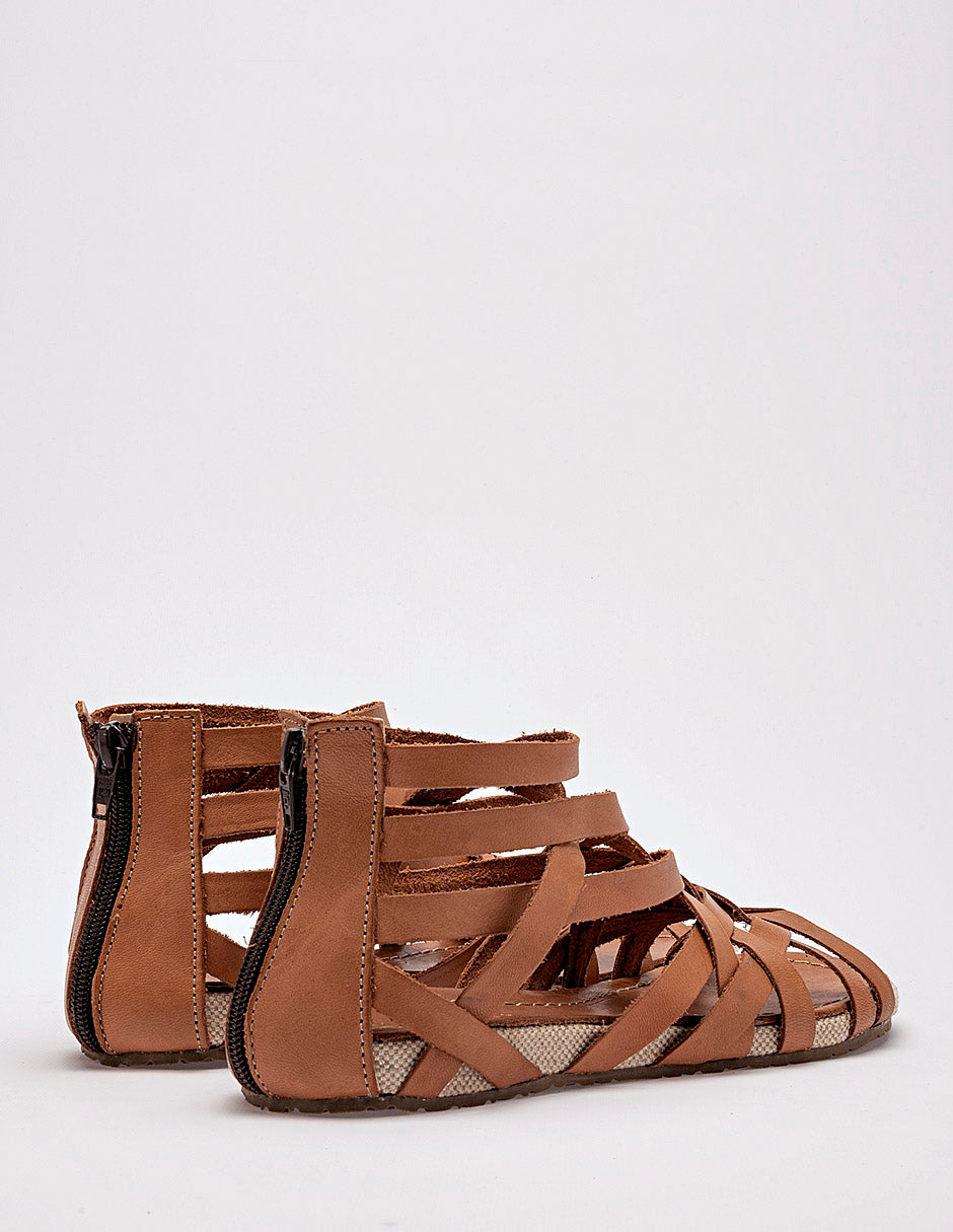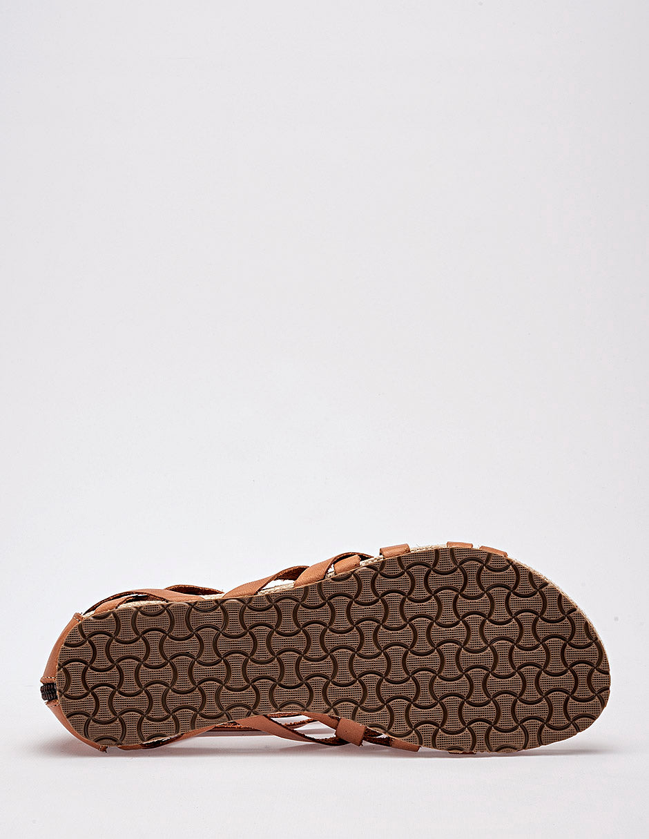 sandalia plana de estilo gladiadora confeccionada en material sintético de color miel o café claro. El diseño destaca por su estructura de múltiples tiras delgadas entrecruzadas que cubren el empeine y suben hacia el tobillo, creando un patrón dinámico y envolvente. Incluye un cierre de cremallera en el talón para facilitar el calce y una suela delgada con un borde de textura tejida en color beige que aporta un toque artesanal. La plantilla es lisa y del mismo tono miel que las correas.
