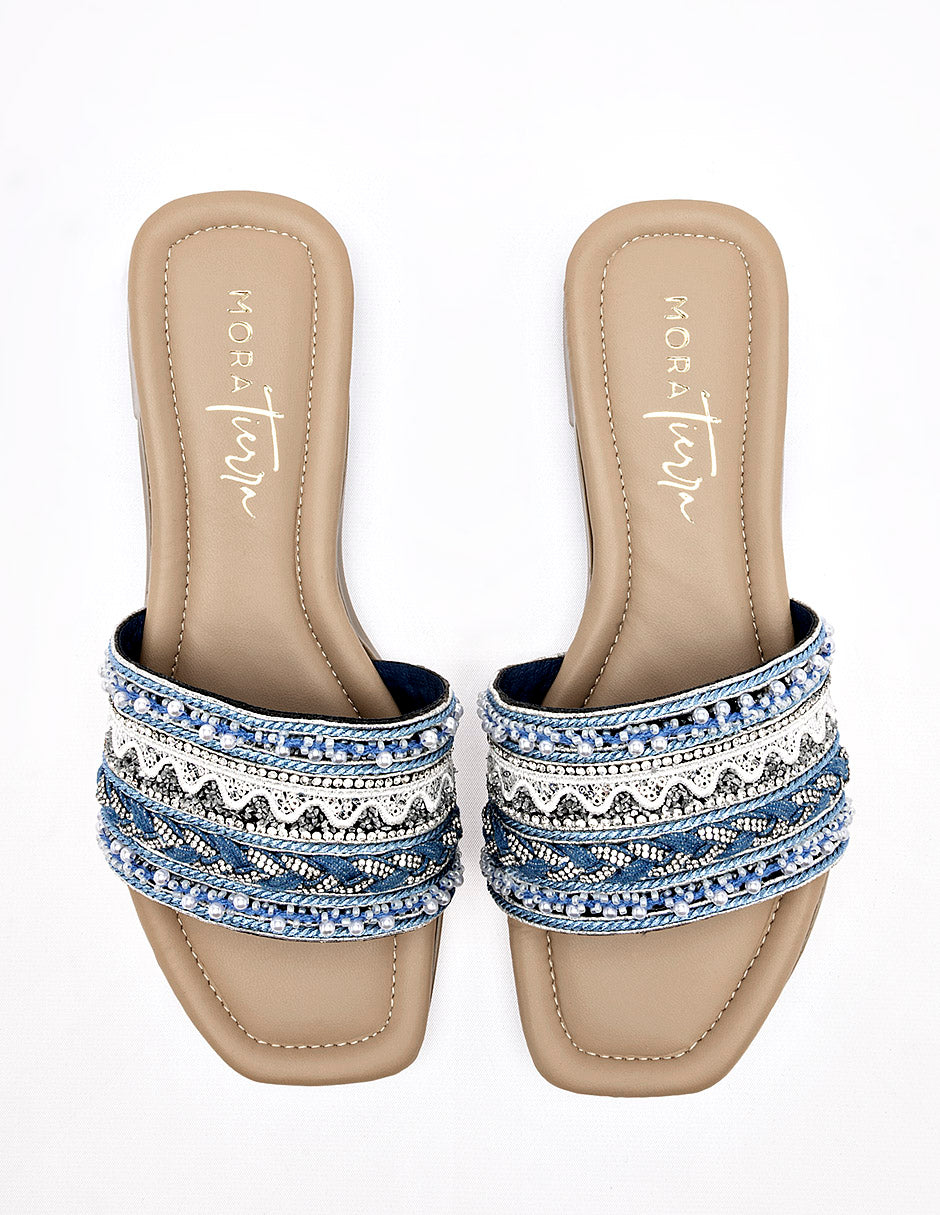 sandalia plana (de piso) con una estética artesanal y detallada. El diseño destaca por una banda frontal ancha confeccionada en una mezcla de texturas que incluye mezclilla azul, encaje blanco y bordados brillantes. La banda está profusamente decorada con aplicaciones de perlas blancas y pedrería plateada que forman patrones geométricos y ondulados. Cuenta con una punta cuadrada moderna, una plantilla de color beige neutro y una suela delgada con un pequeño tacón plano para mayor comodidad.